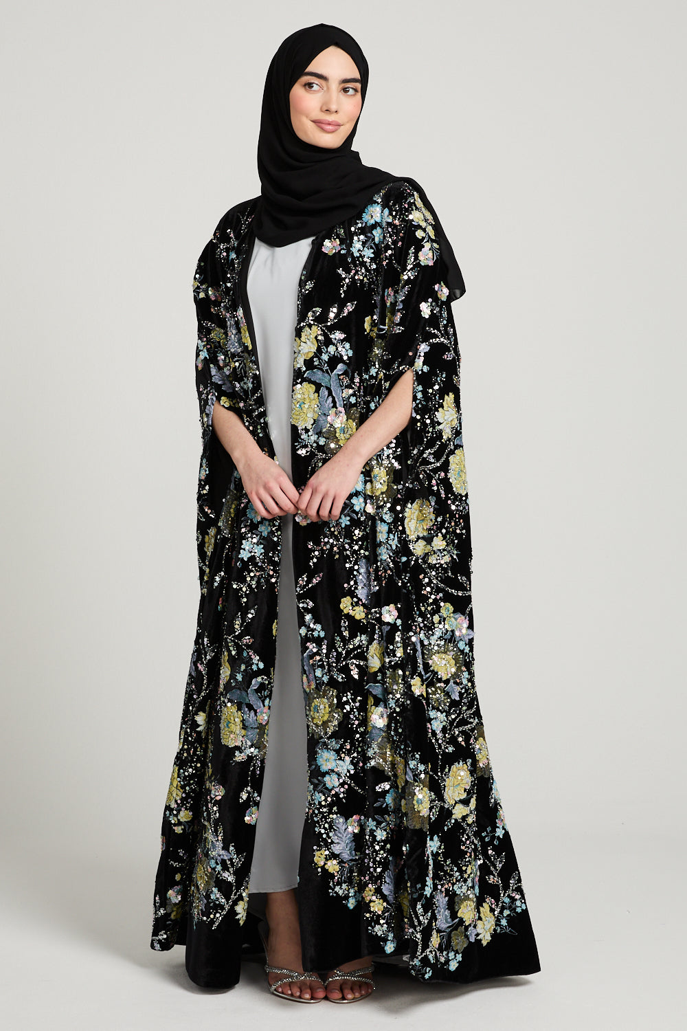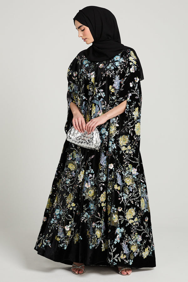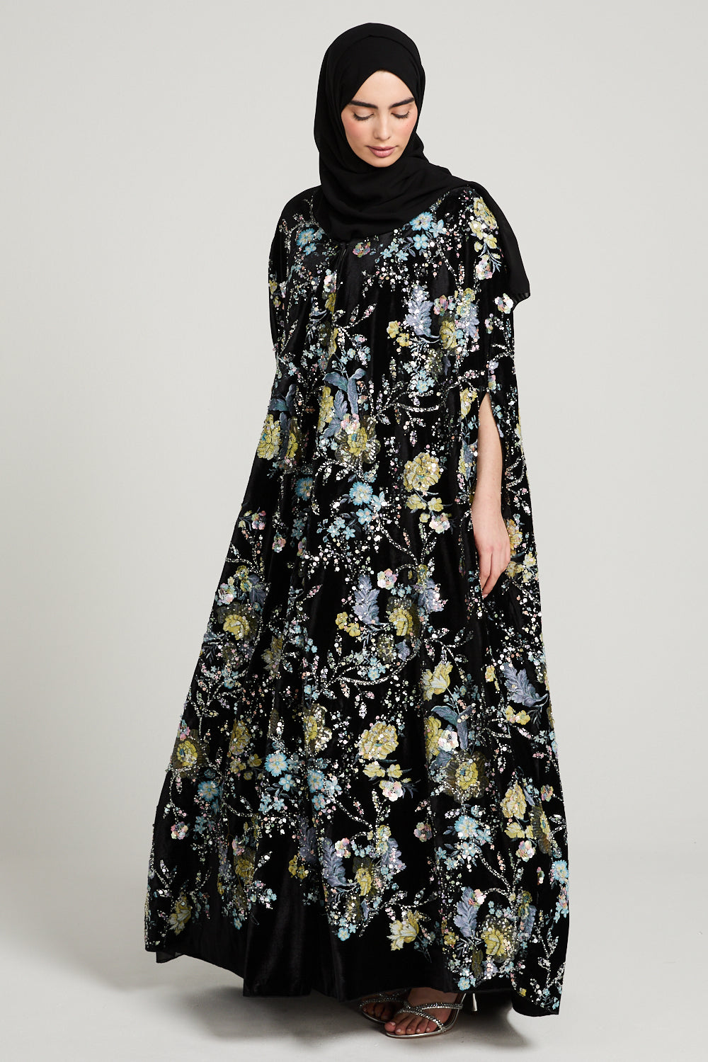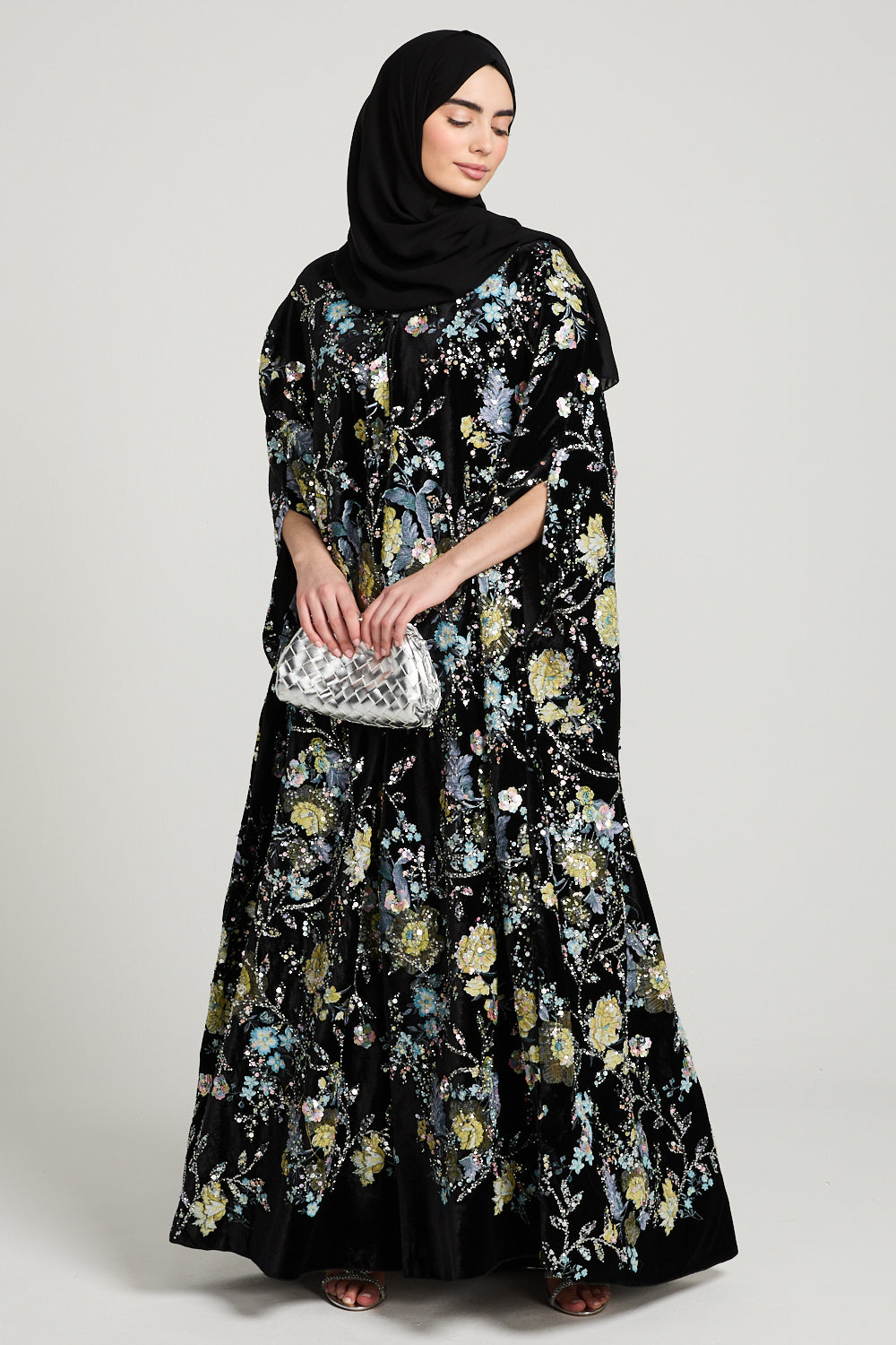 The rich velvet fabric drapes effortlessly, creating a graceful and fluid silhouette that moves with you. The vibrant floral accents bring a timeless, artistic charm that makes this cape the perfect statement piece for special occasions or evening events.