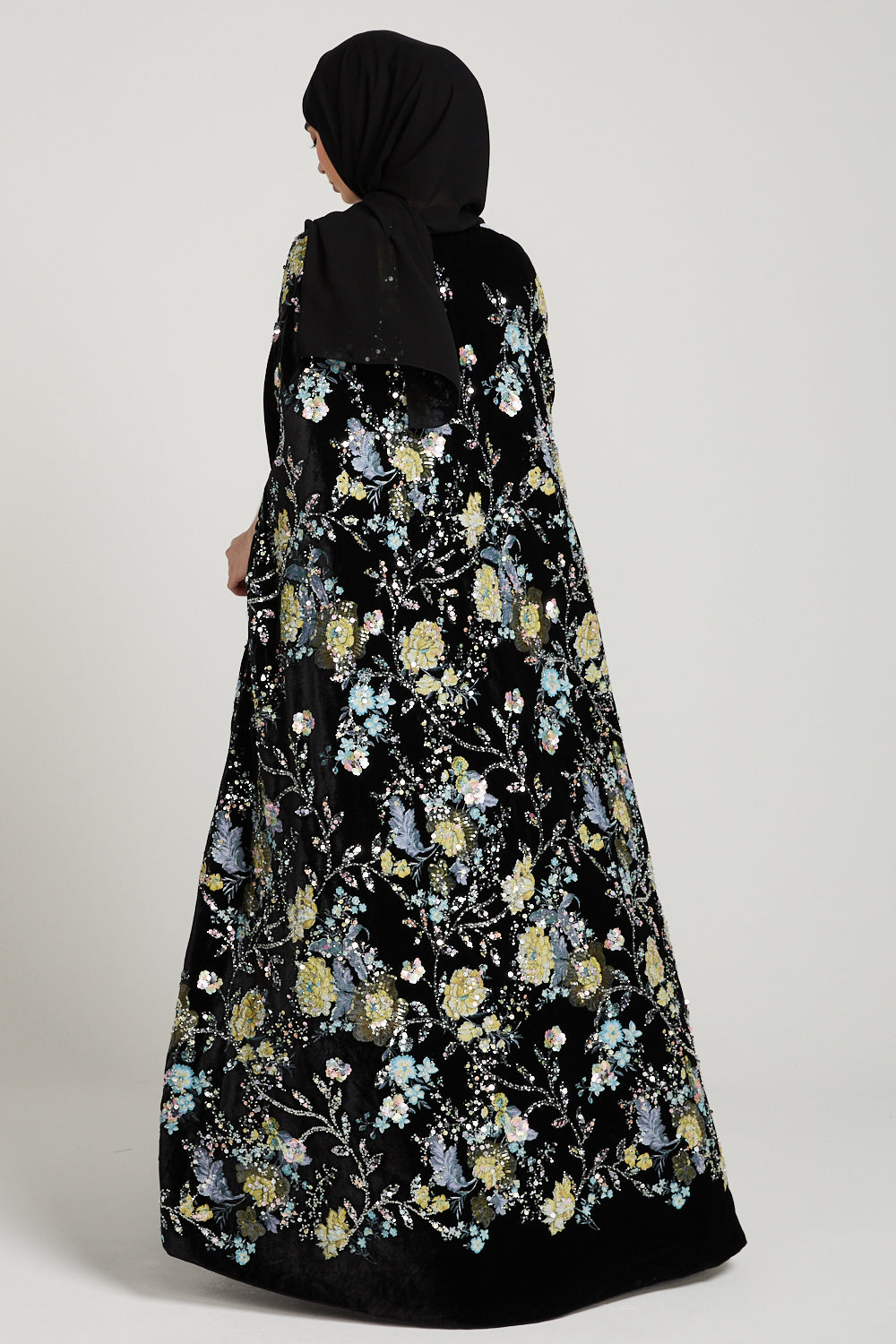 Step into a world of refined beauty with the Luxury Twilight Bloom Velvet Cape - Daffodil Dream. Crafted from sumptuous velvet, this cape features delicate floral appliques in soft sapphire blue and radiant golden yellow, each adorned with sequins, embroidery, and glass beads for a touch of sophisticated detail.
