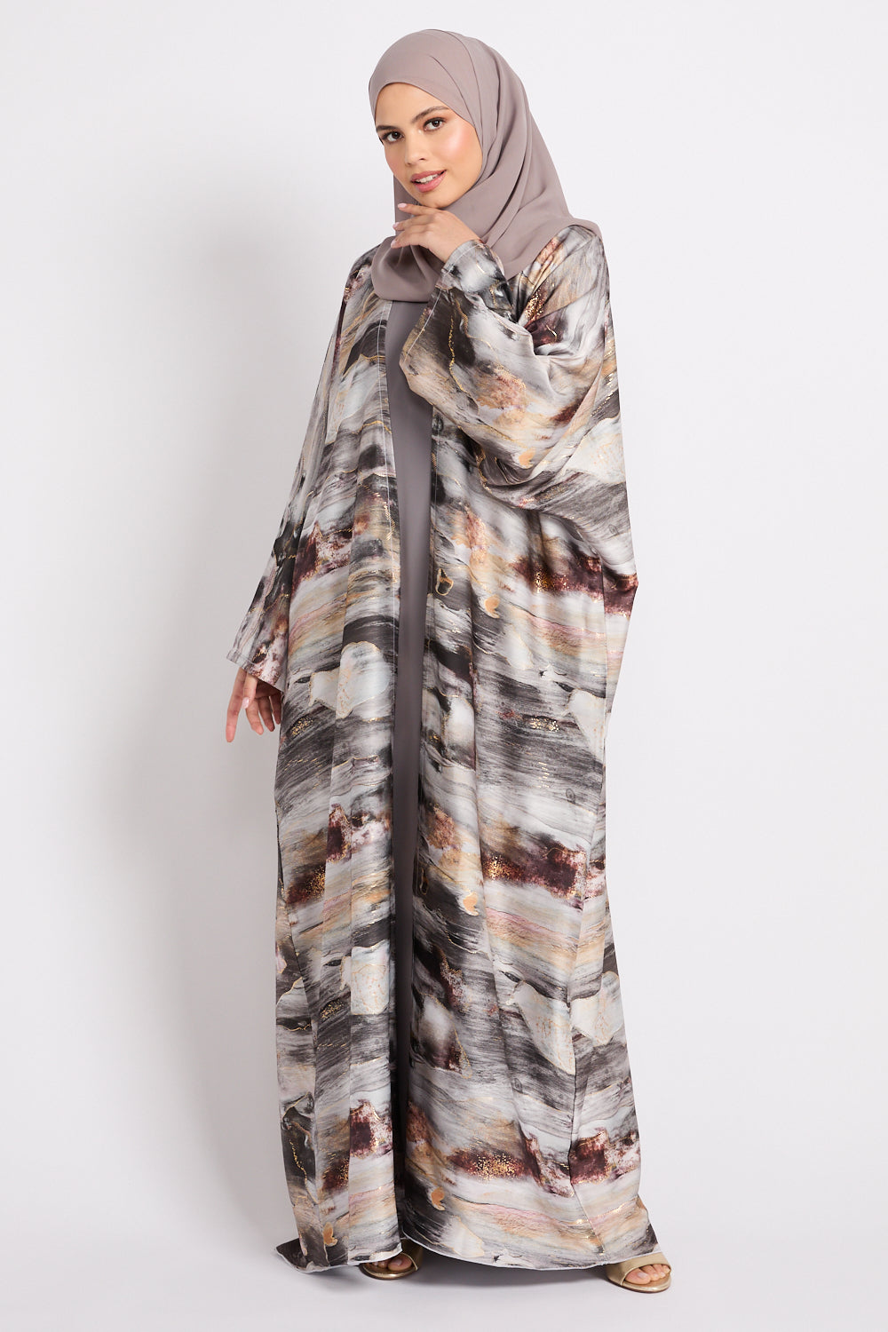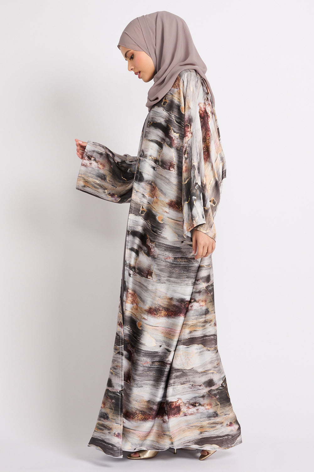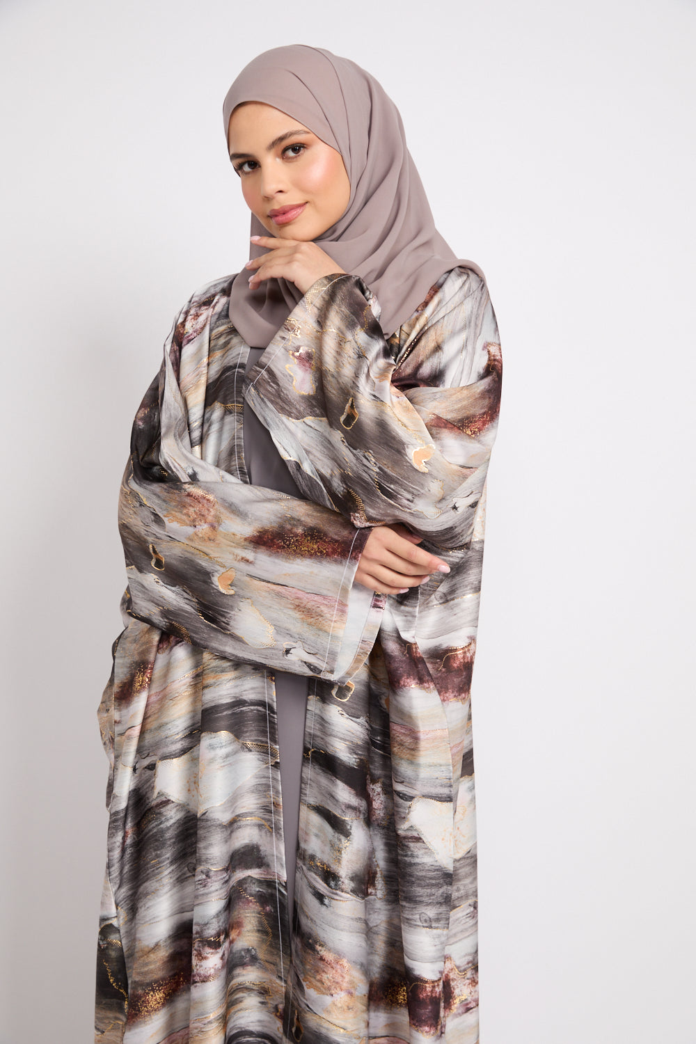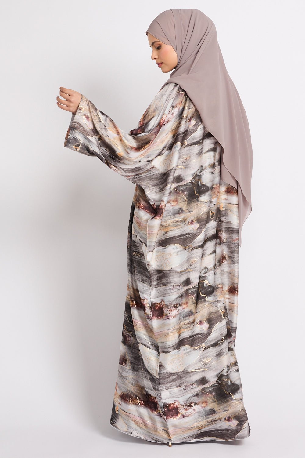 Designed with a fluid open silhouette, this abaya features an abstract, multi-tonal print that blends soft taupe with smoky greys and warm metallic accents. The interplay of light and shadow gives the piece its celestial depth, revealing new details with every step.