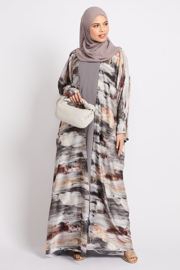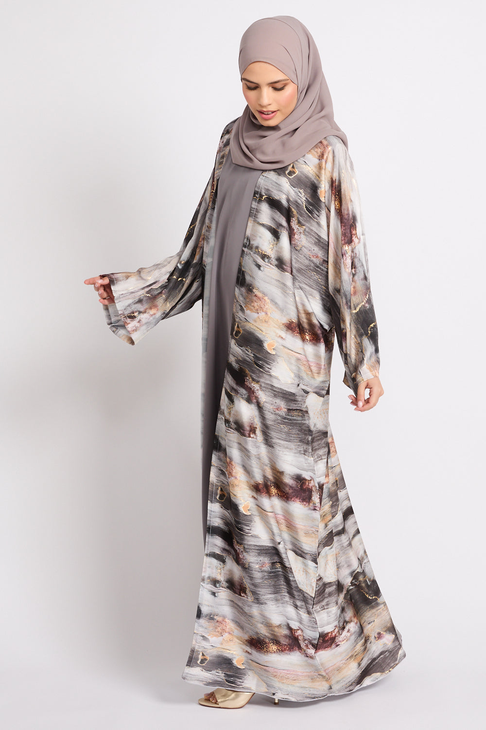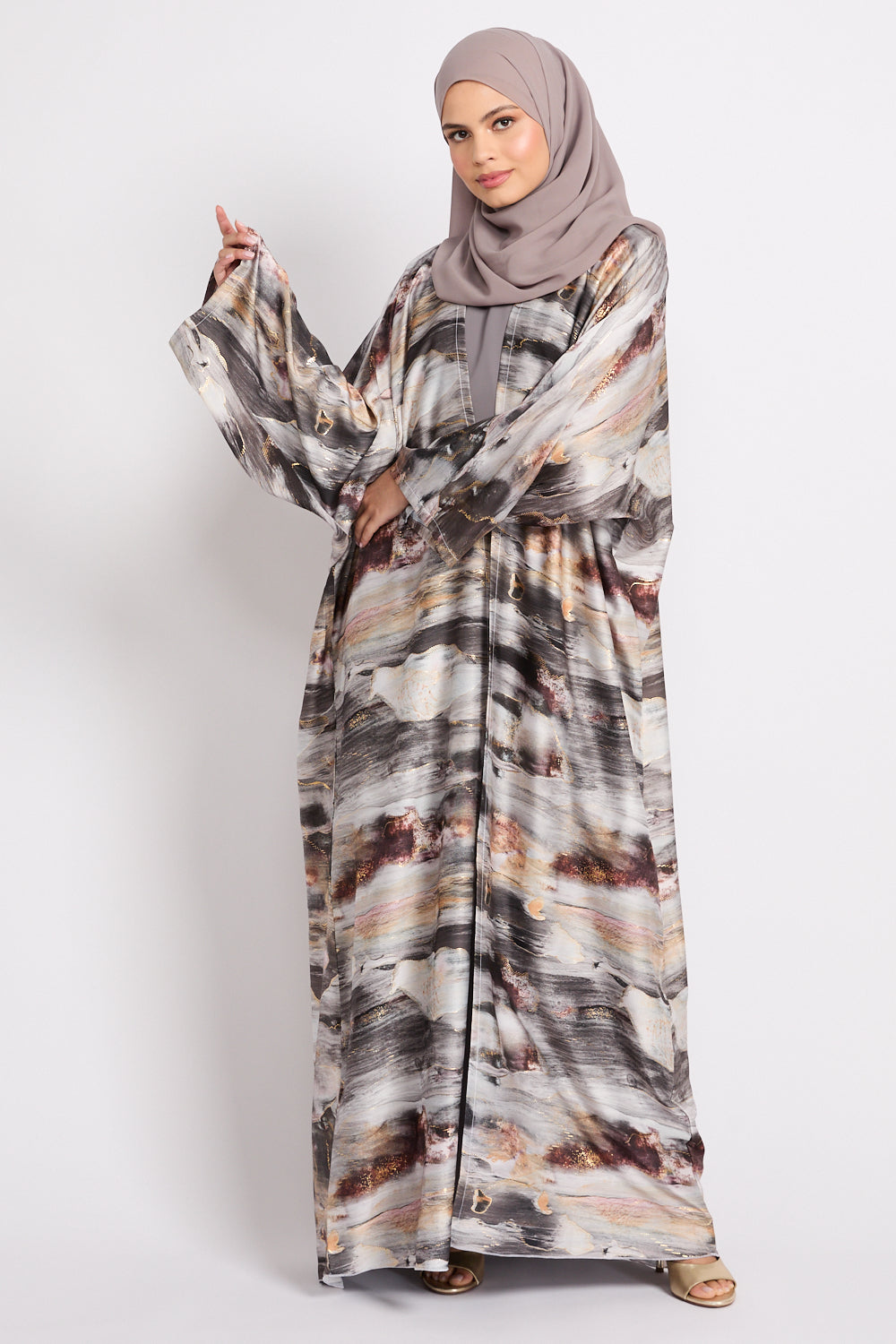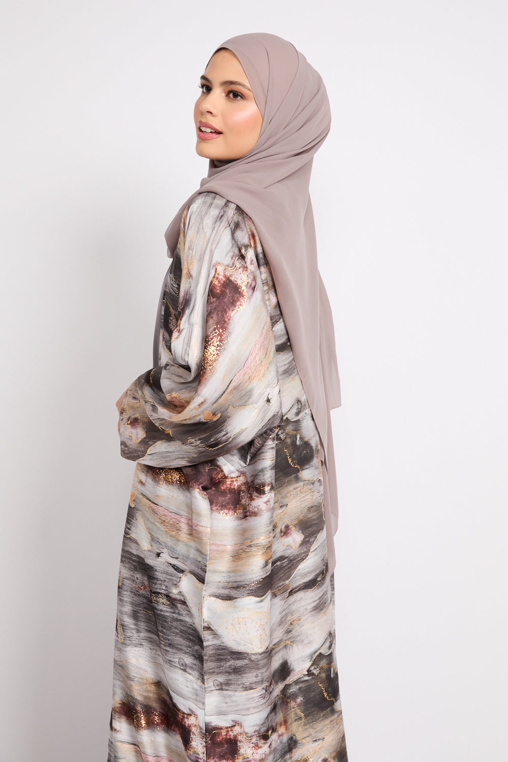 Designed with a fluid open silhouette, this abaya features an abstract, multi-tonal print that blends soft taupe with smoky greys and warm metallic accents. The interplay of light and shadow gives the piece its celestial depth, revealing new details with every step.