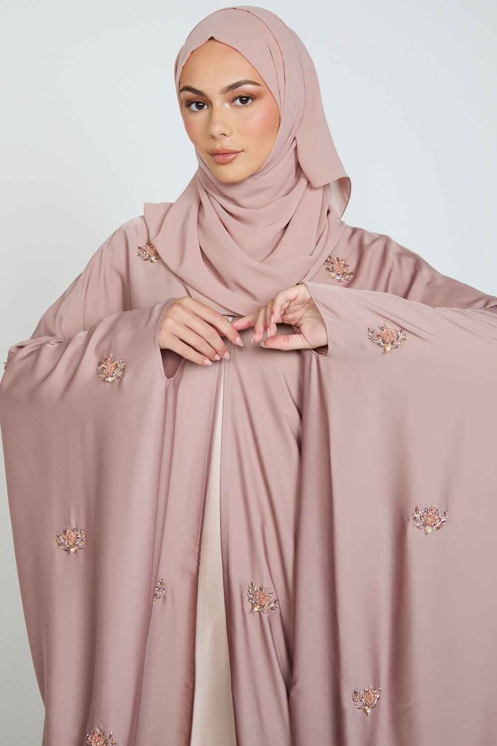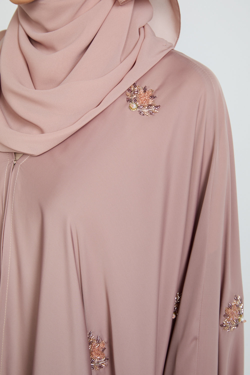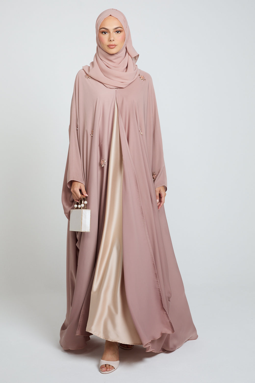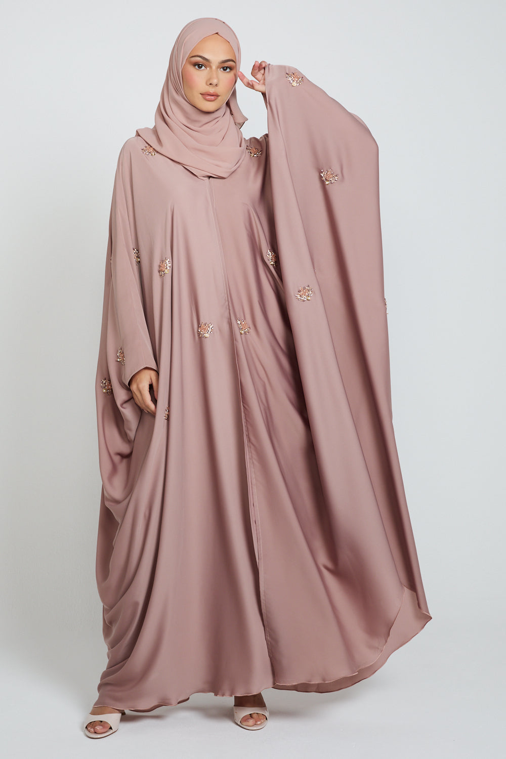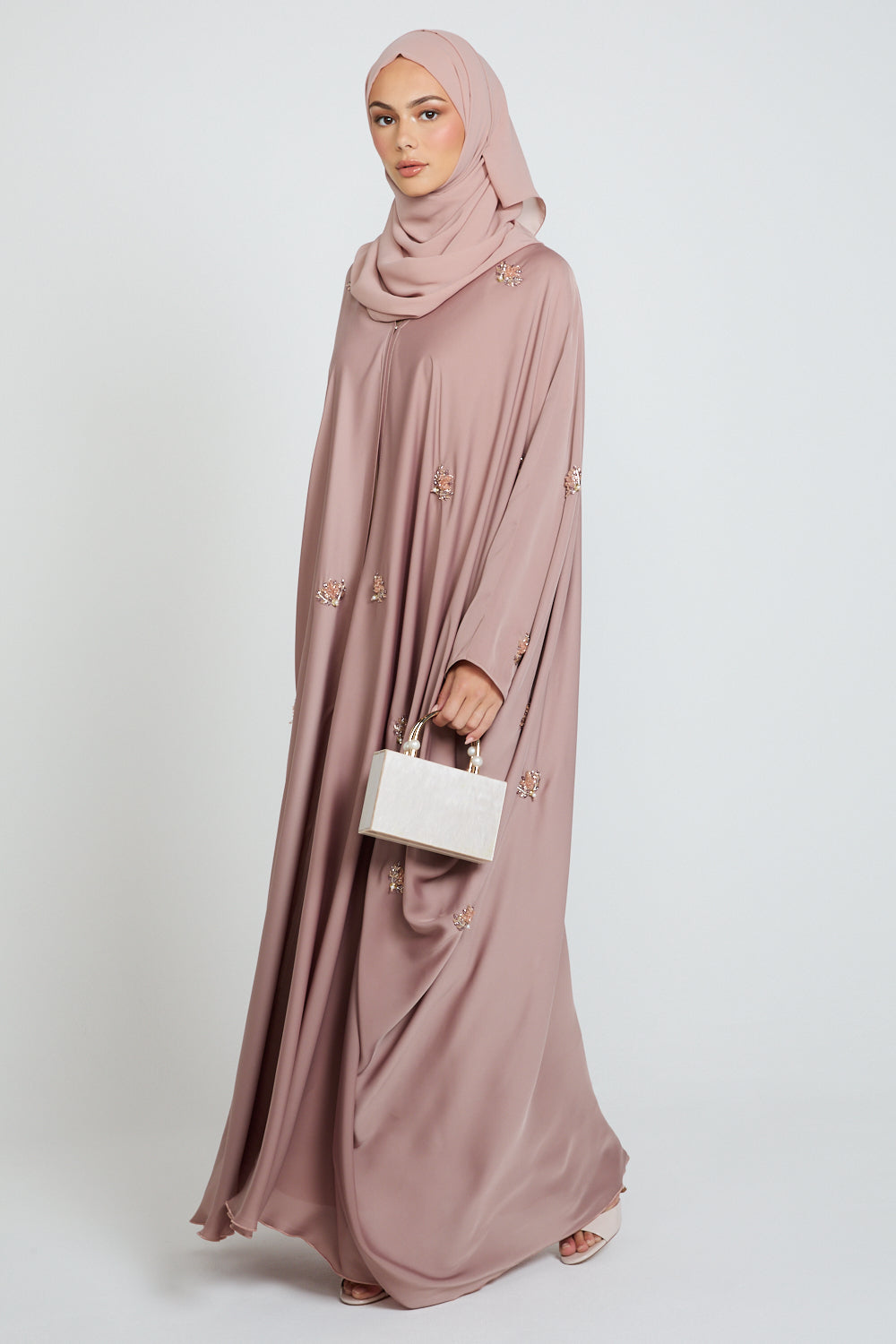 Introducing the Premium Embellished Stone Blush Open Farasha—a graceful expression of femininity and timeless elegance. The Stone Blush shade, a gentle fusion of warm beige and muted rose, offers a soft, refined tone that blends effortlessly into any wardrobe. Understated yet sophisticated, it brings a calm, graceful charm to every occasion.