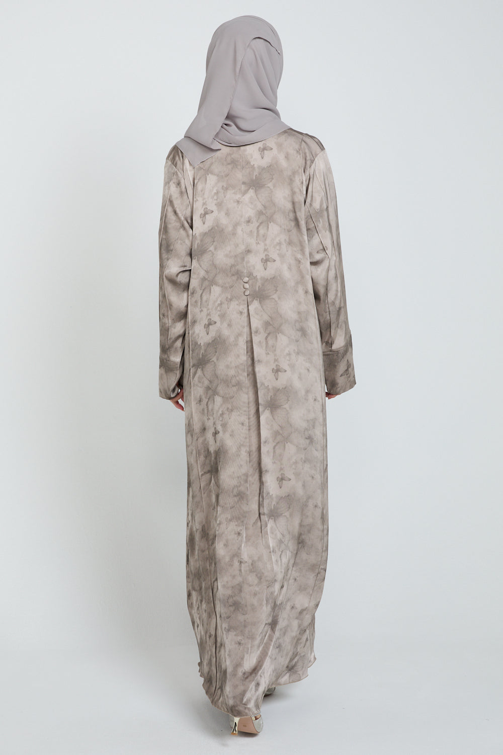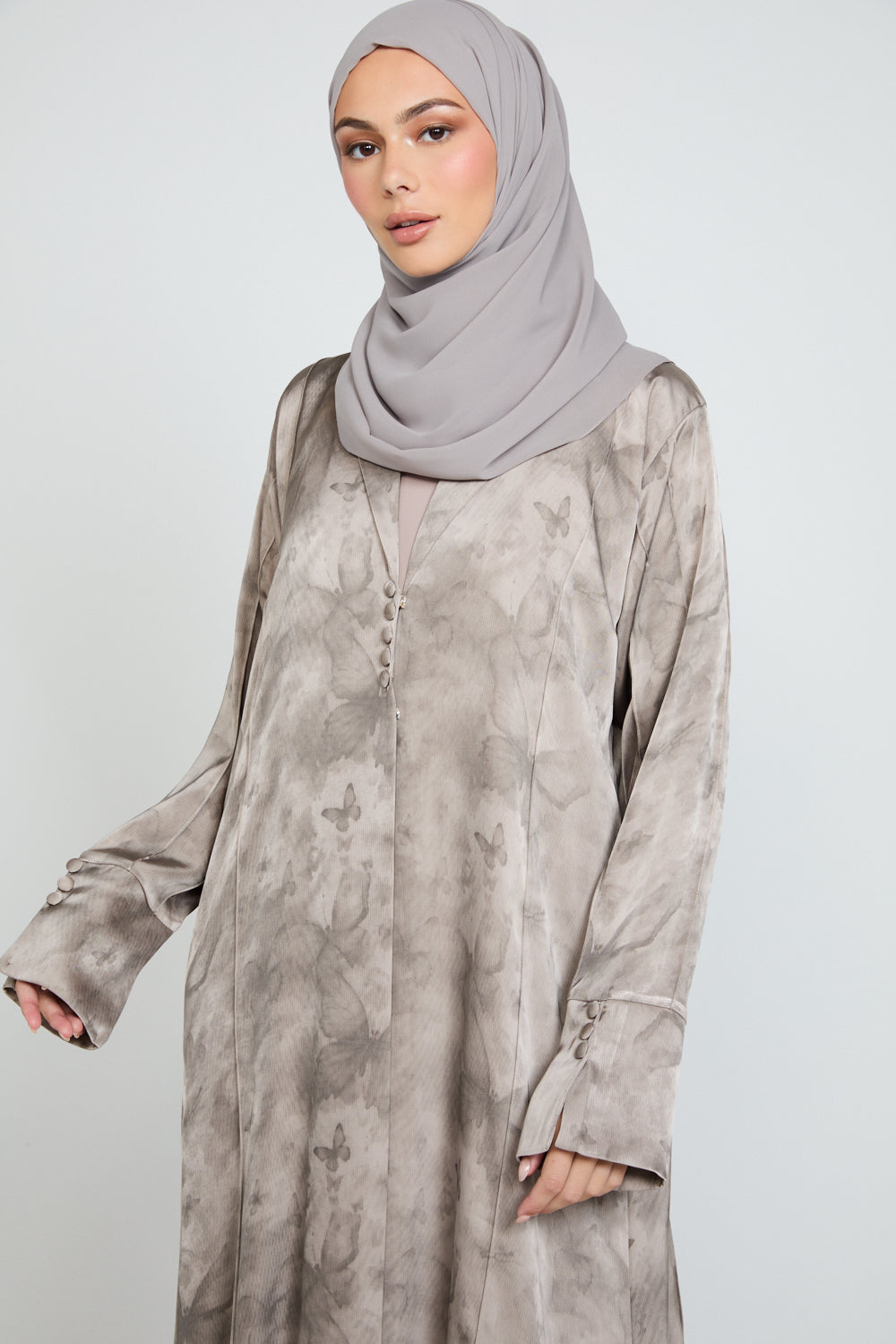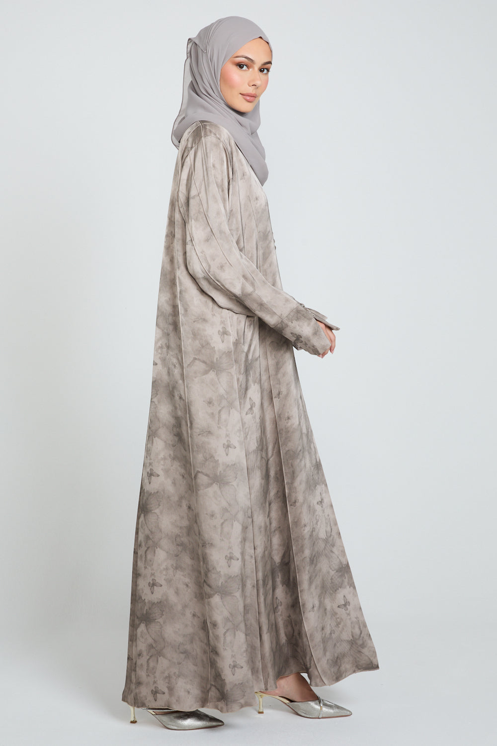 The dreamy print evokes a mirage of butterflies drifting into bloom, subtly scattered across the fabric like a whispered pattern in motion. Rendered in a warm, muted neutral tone with soft earthy undertones, Desert Mist brings an air of quiet luxury to every step.