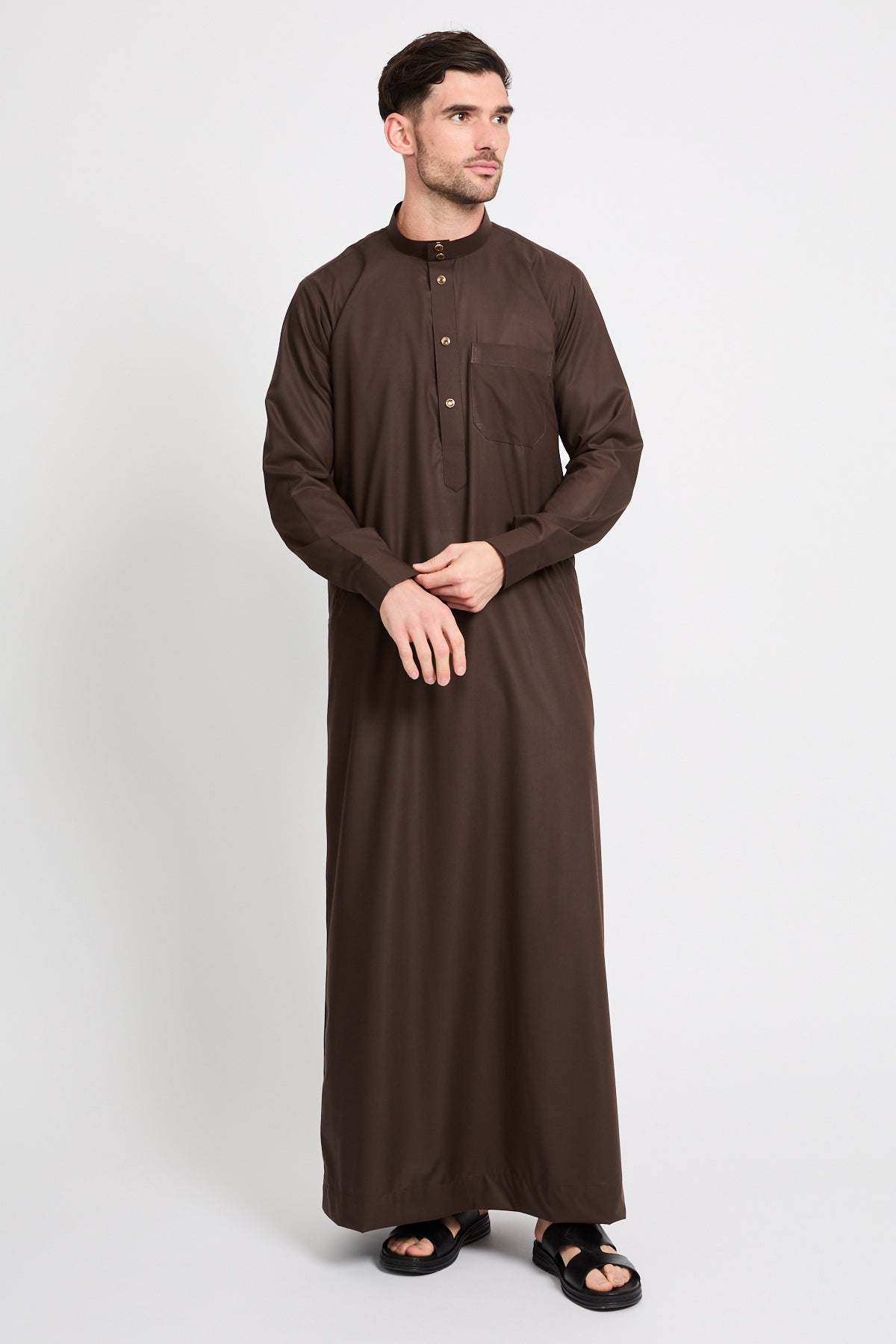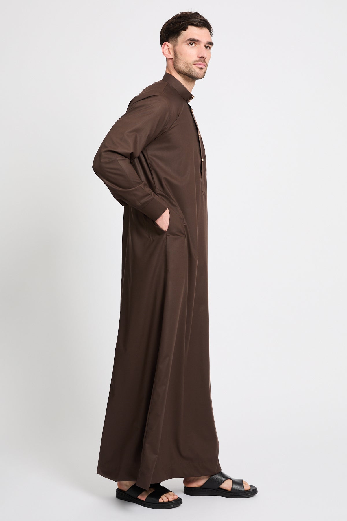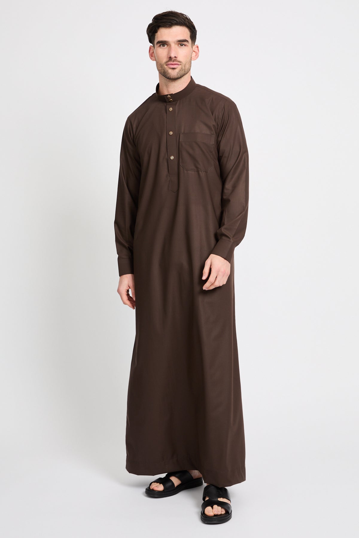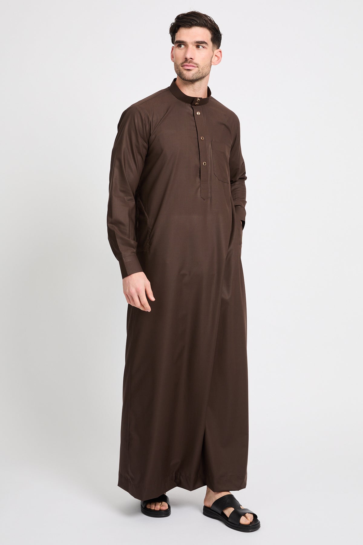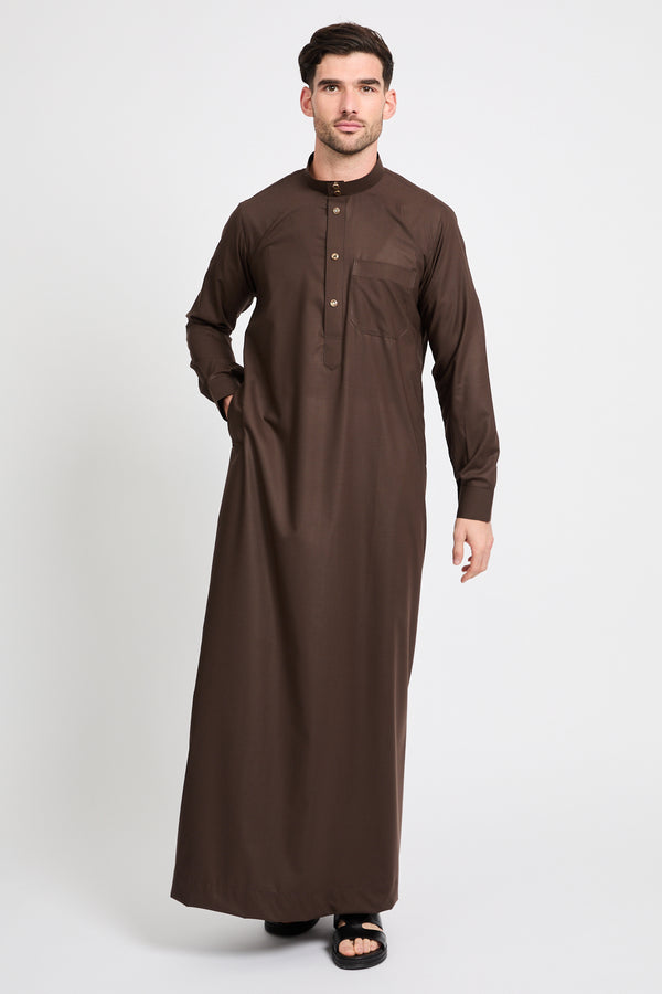 The warm chestnut tone brings depth and richness, pairing beautifully with the thobe’s tailored silhouette. Traditional button detailing along the placket and collar nods to classic heritage design, while the streamlined cut and precise finishing keep the look contemporary and sharp. A functional chest pocket adds practicality without disrupting the refined aesthetic.