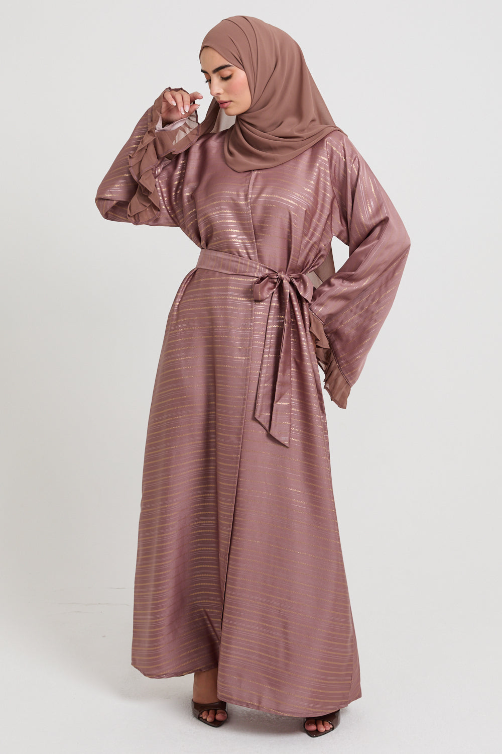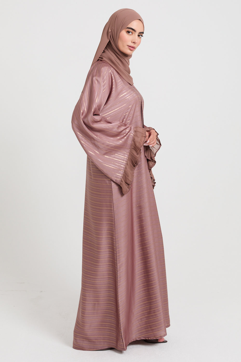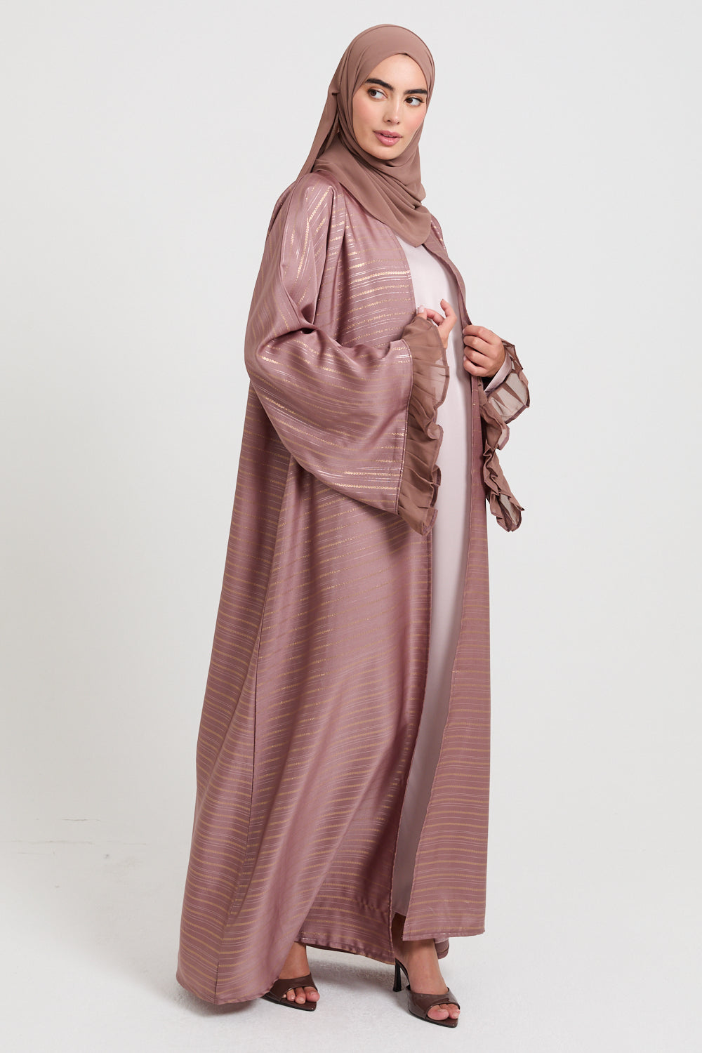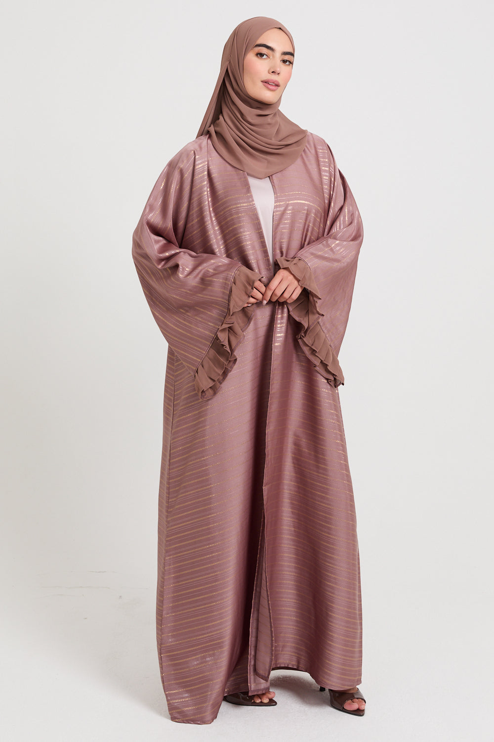 This open abaya is thoughtfully designed with flared sleeves, enhanced by chiffon frill detailing at the cuffs, bringing an air of refined femininity and effortless movement. Perfect for any celebration, its understated elegance ensures you feel your best on every occasion.