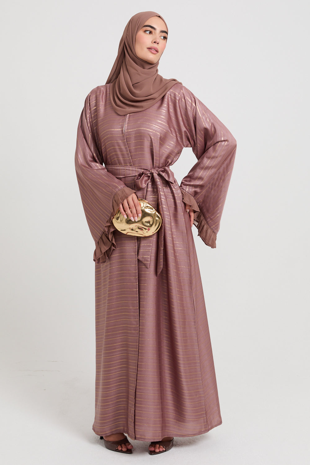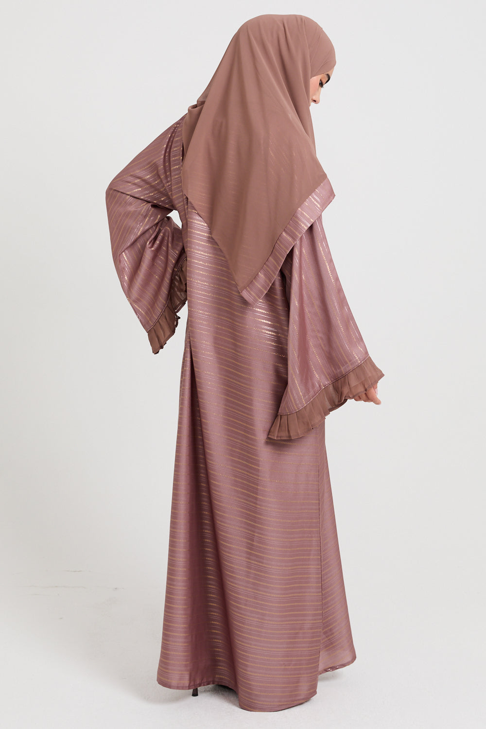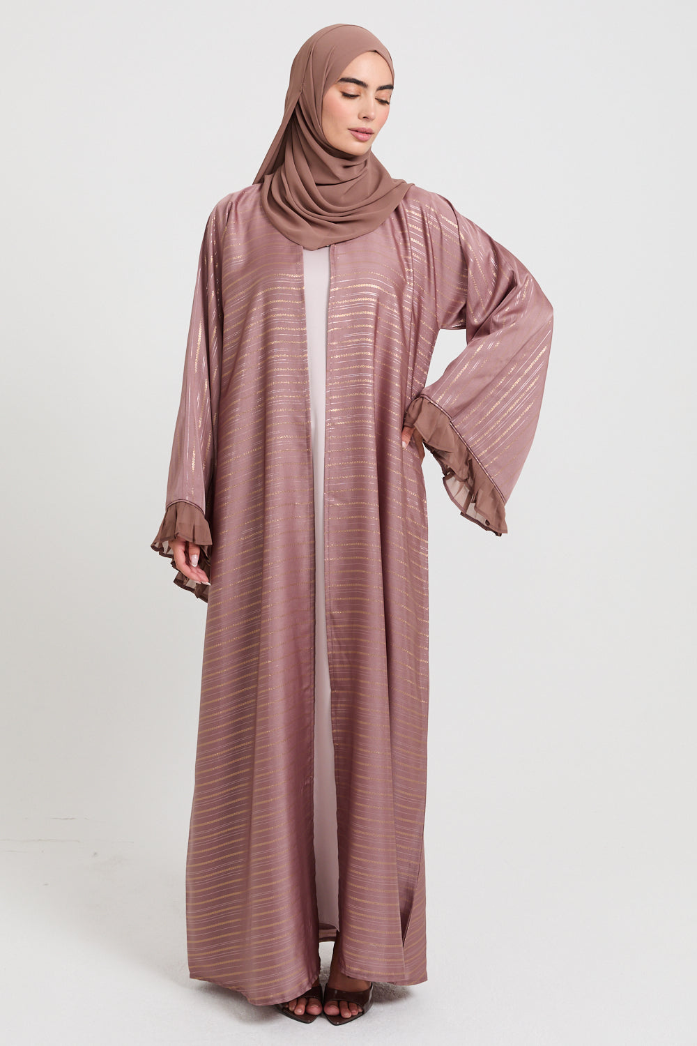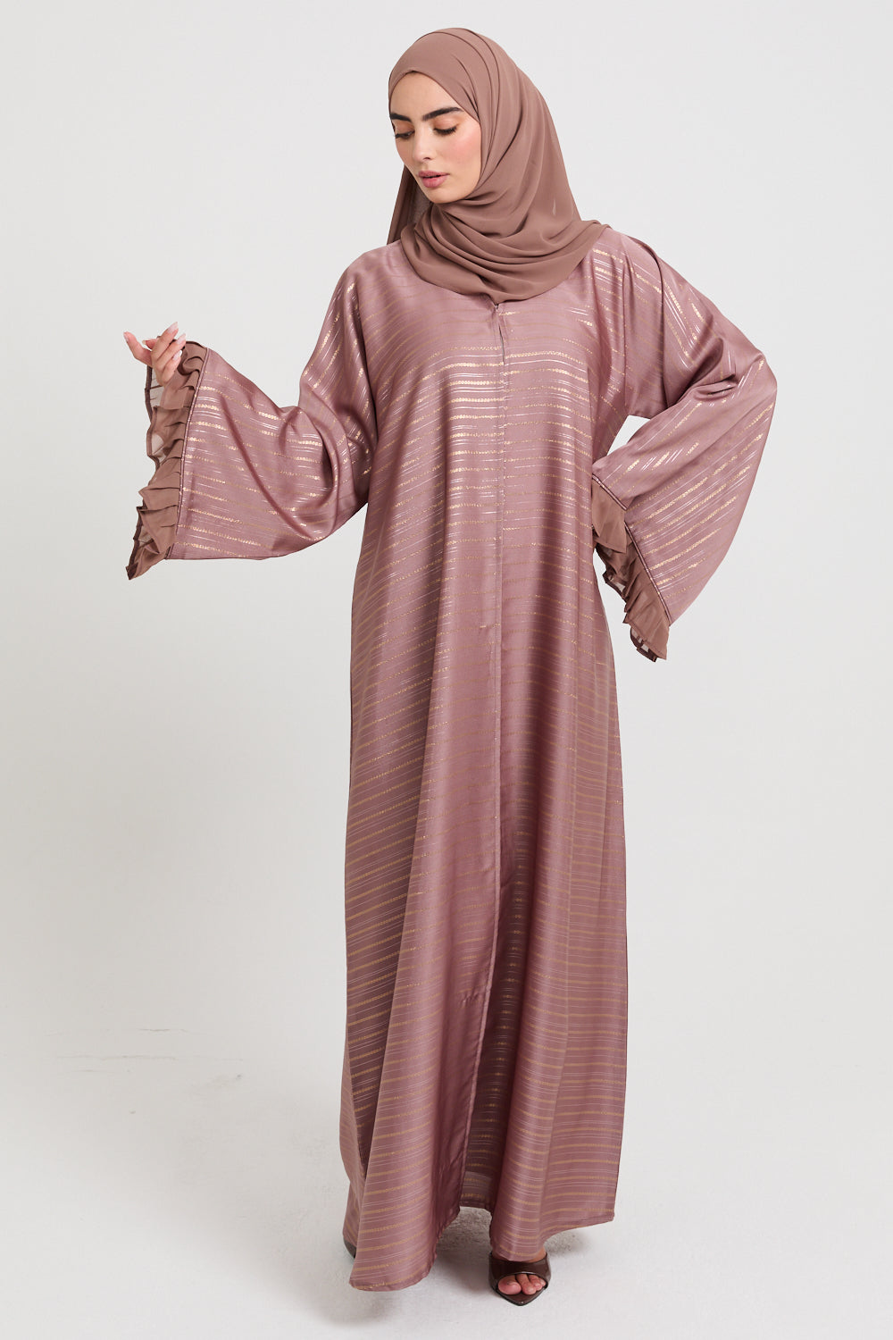 This open abaya is thoughtfully designed with flared sleeves, enhanced by chiffon frill detailing at the cuffs, bringing an air of refined femininity and effortless movement. Perfect for any celebration, its understated elegance ensures you feel your best on every occasion.