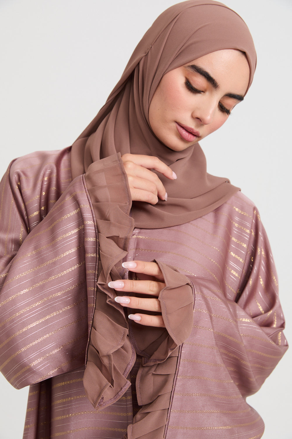 Embody effortless grace and timeless femininity with our Premium Jacquard Floral Open Abaya in Mauve Rose, a LIMITED EDITION piece that exudes refined elegance. The delicate floral jacquard pattern subtly weaves through the luxurious fabric, offering a soft, textured finish that complements the gentle blush hue for a look that feels as serene as it is sophisticated.