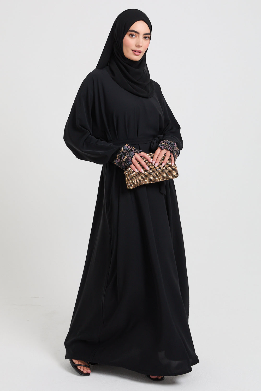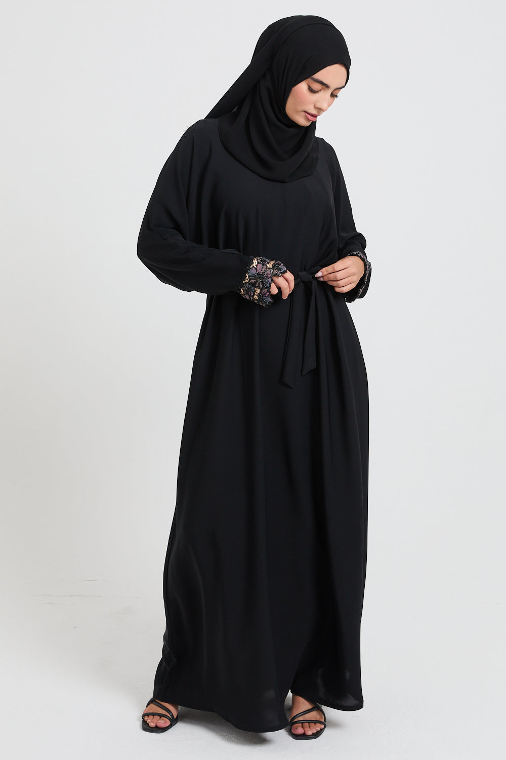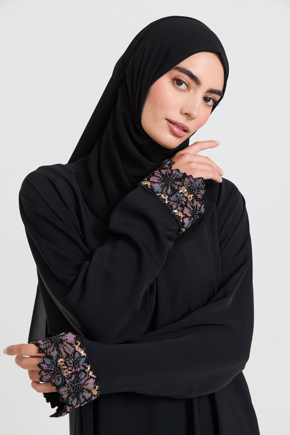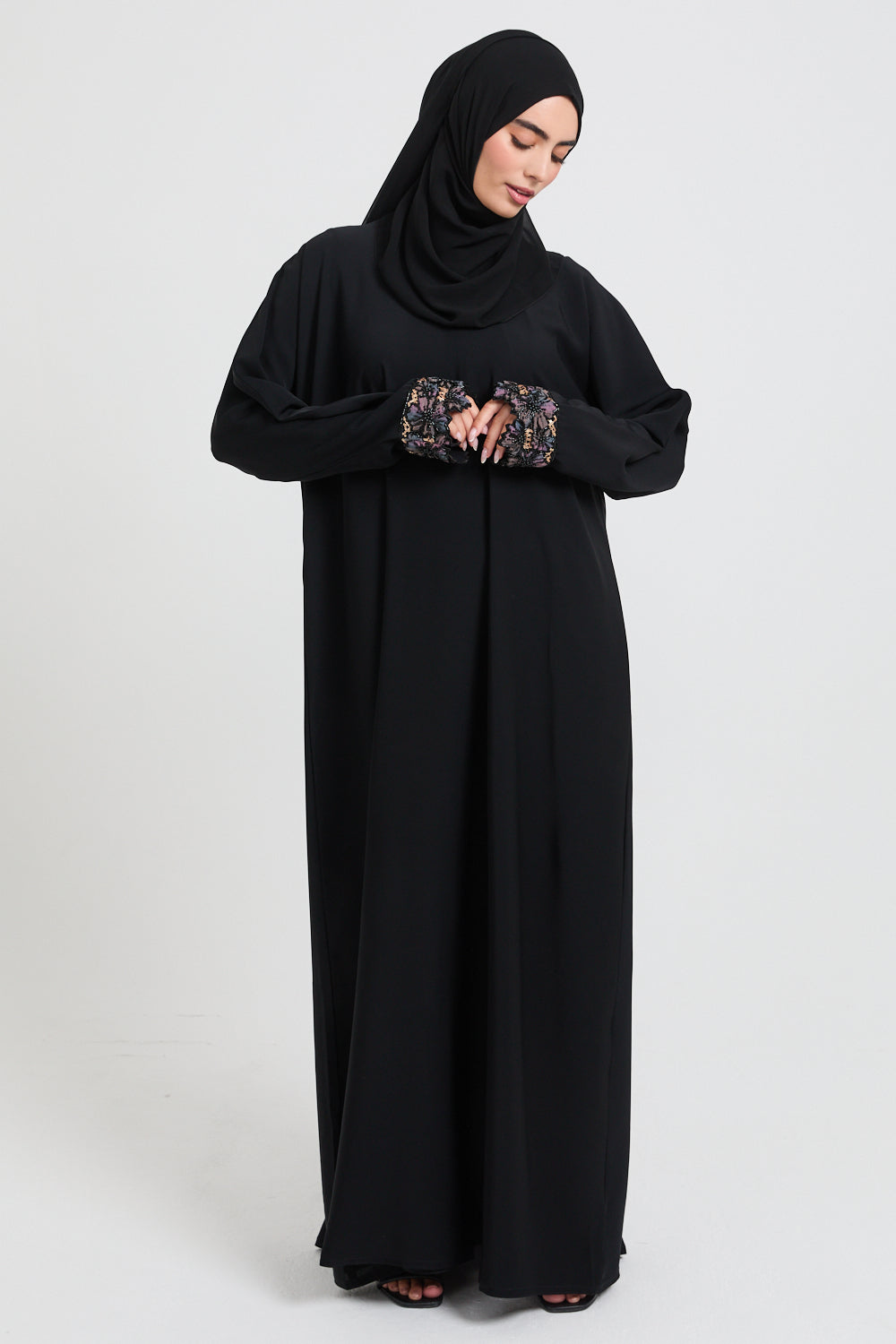 Premium Plain Closed Abaya with Floral Lace Cuff - Black