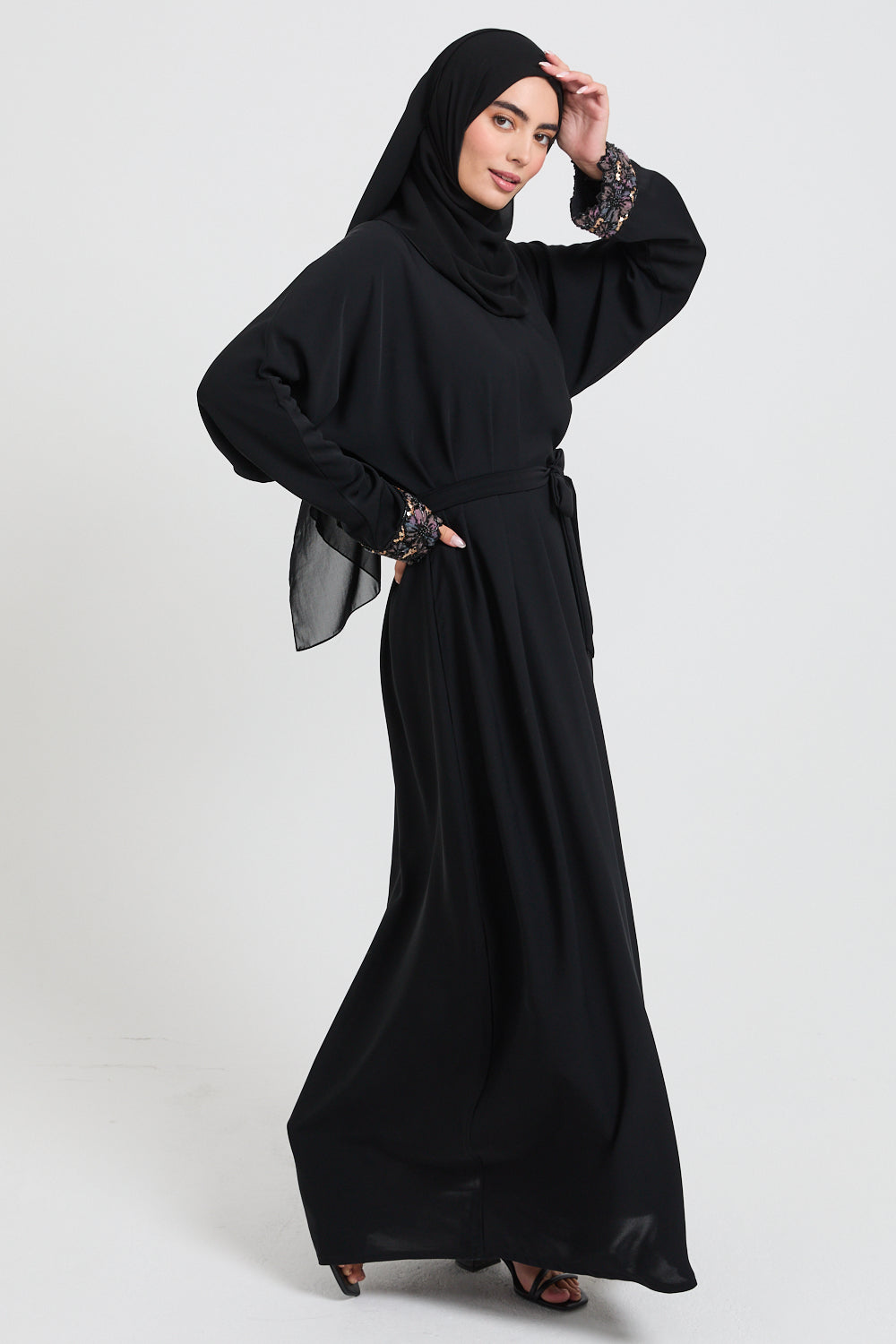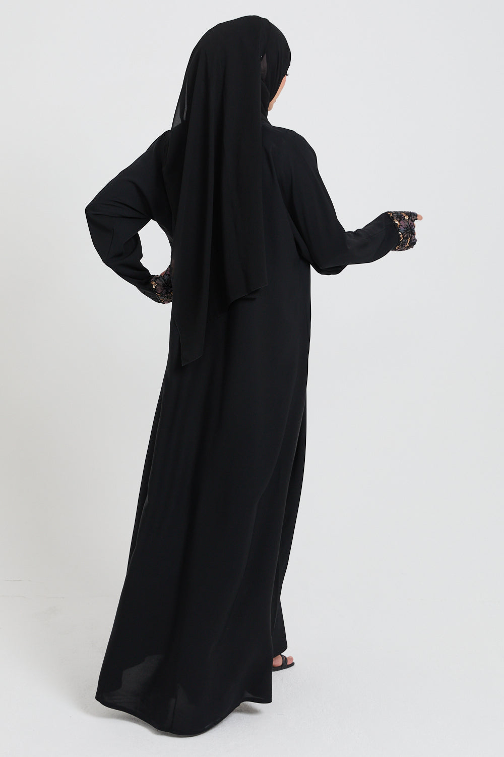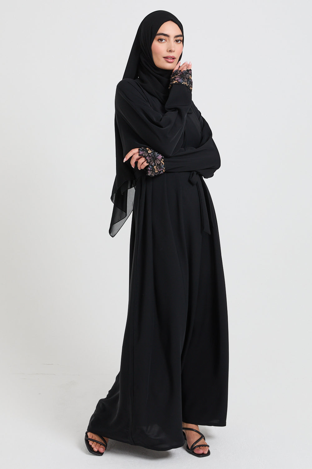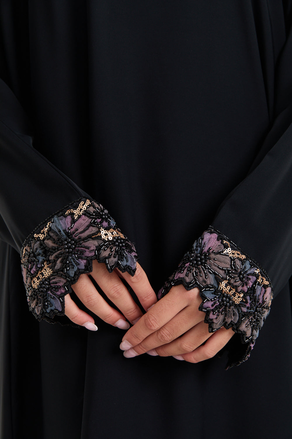 Premium Plain Closed Abaya with Floral Lace Cuff - Black