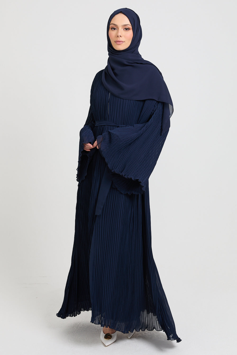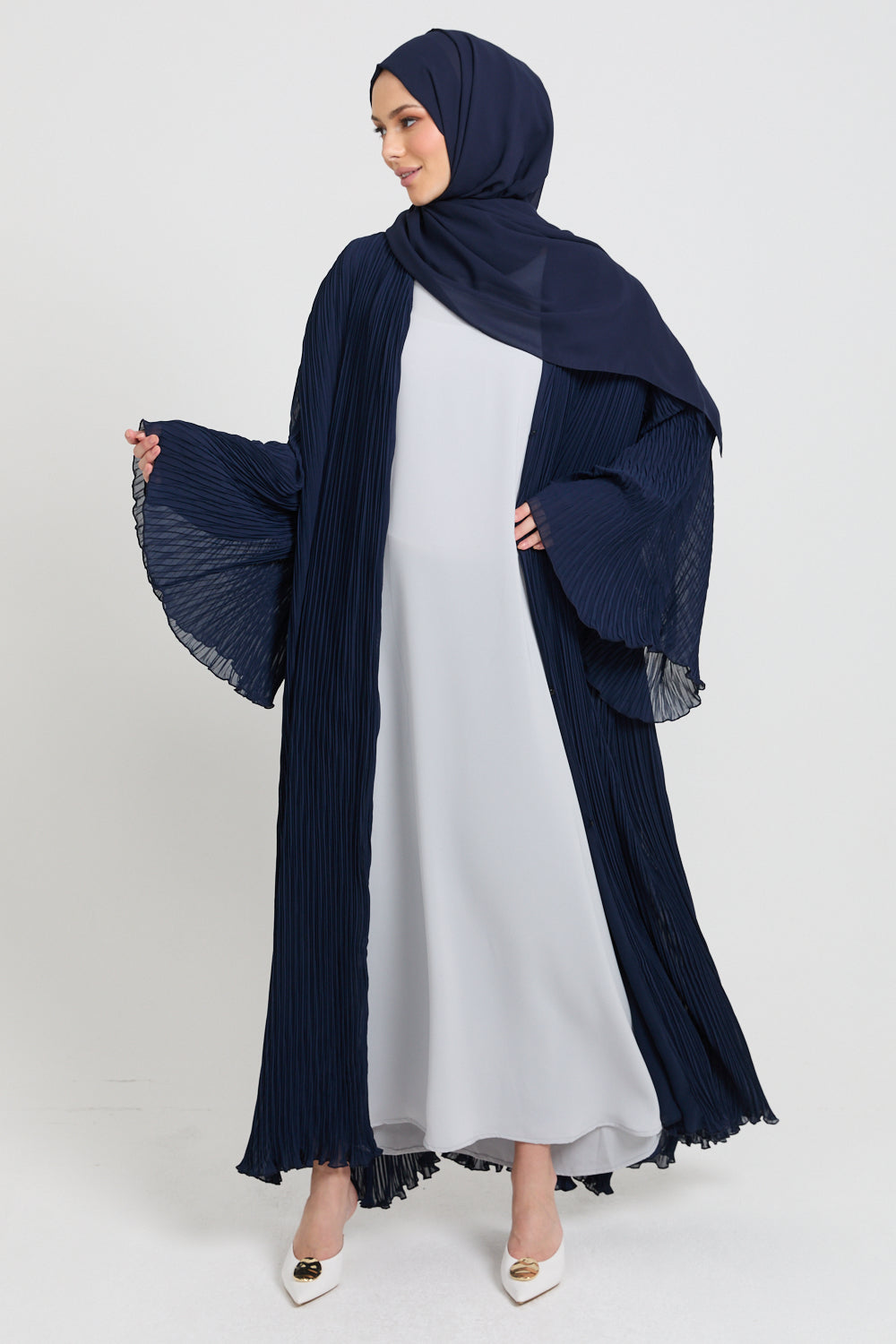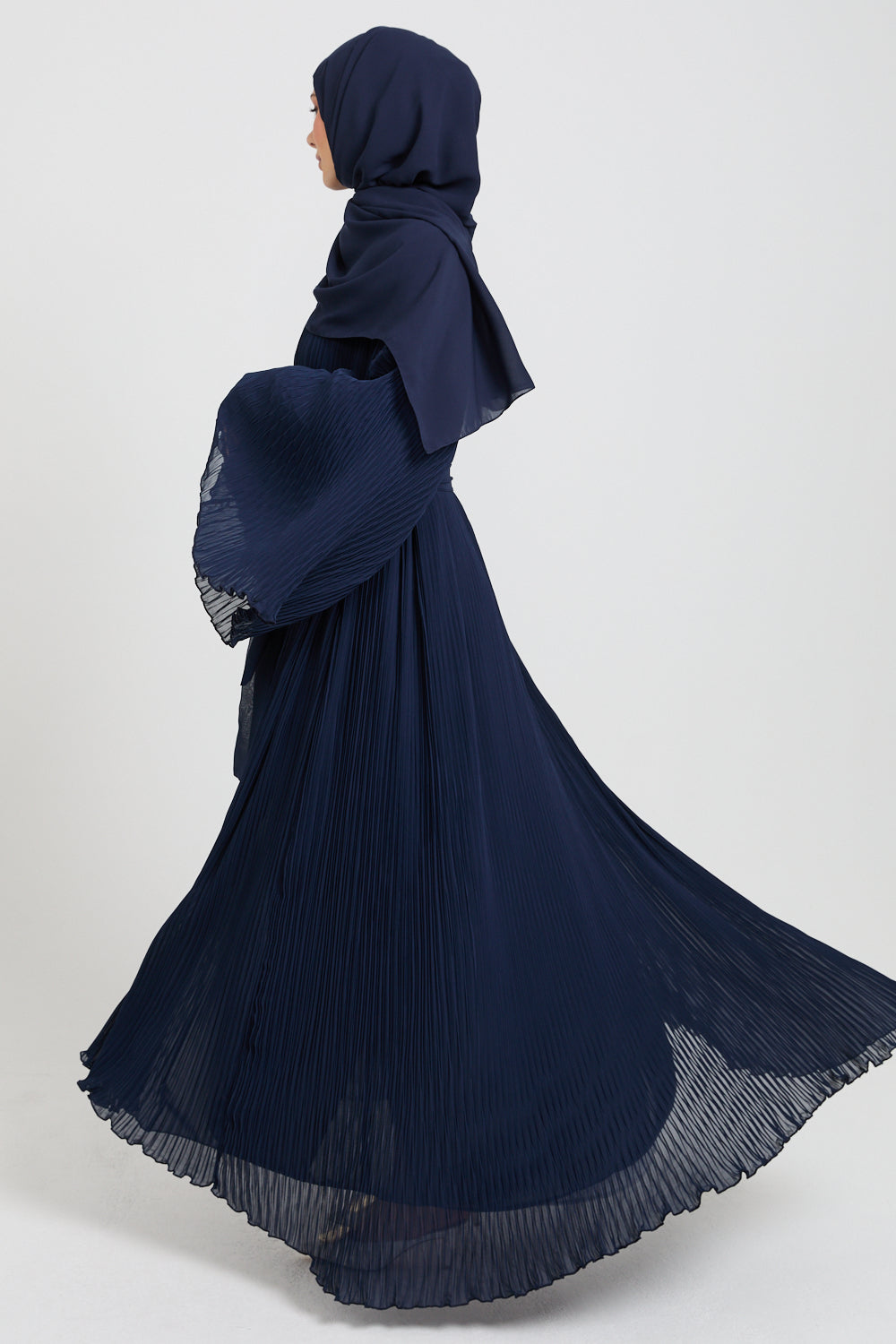 Premium Pleated Open Abaya with Flared Sleeves - Navy