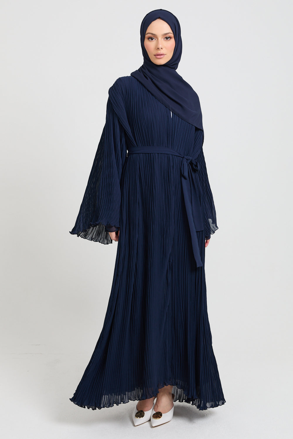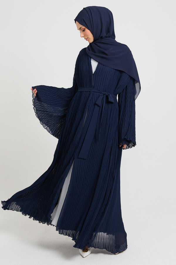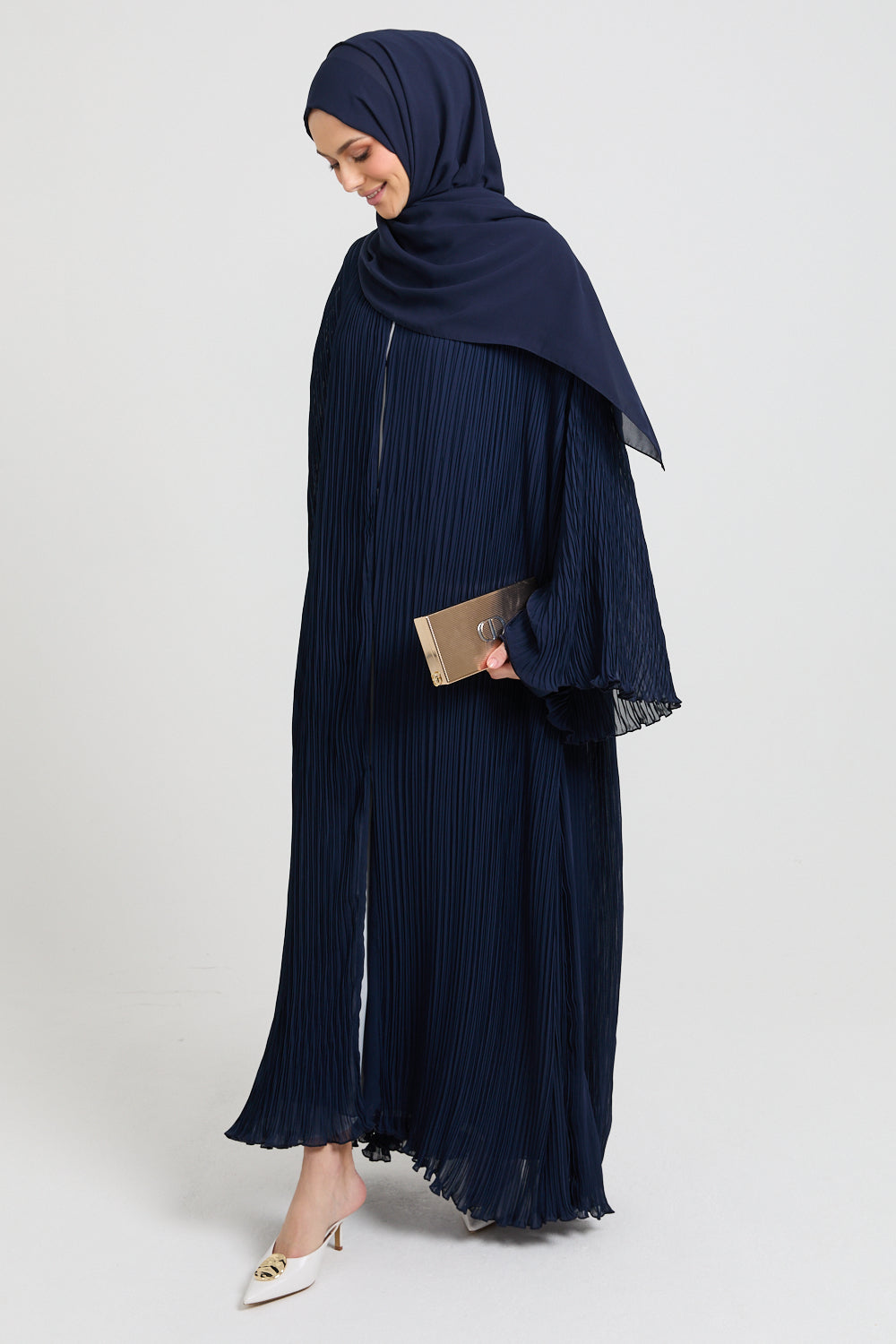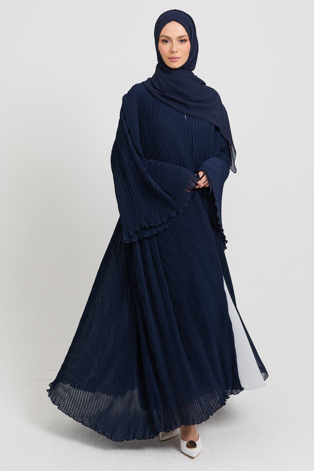 Premium Pleated Open Abaya with Flared Sleeves - Navy