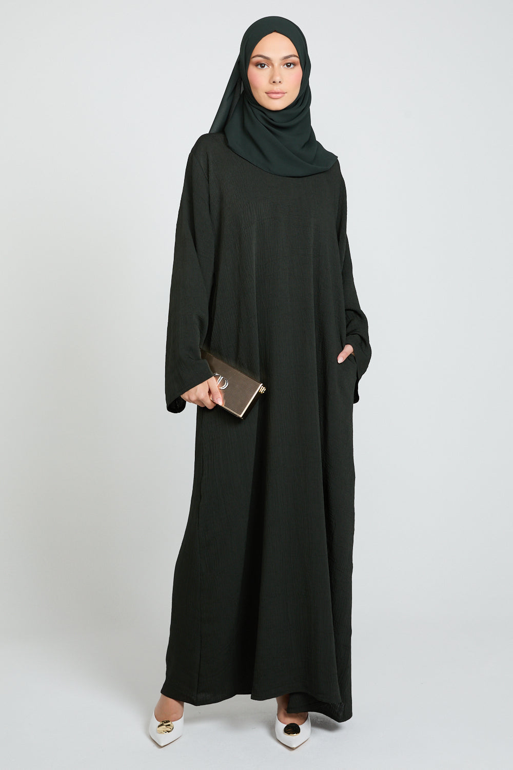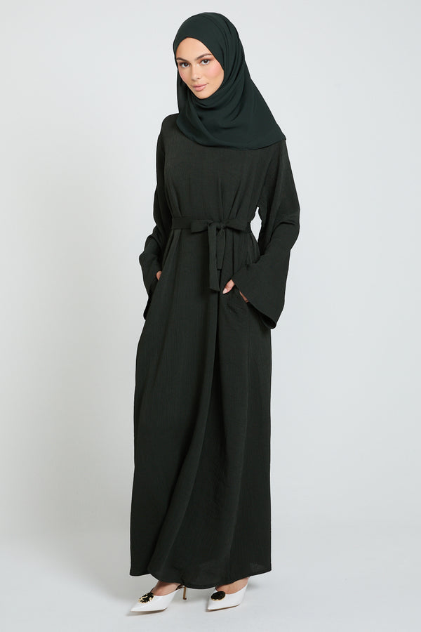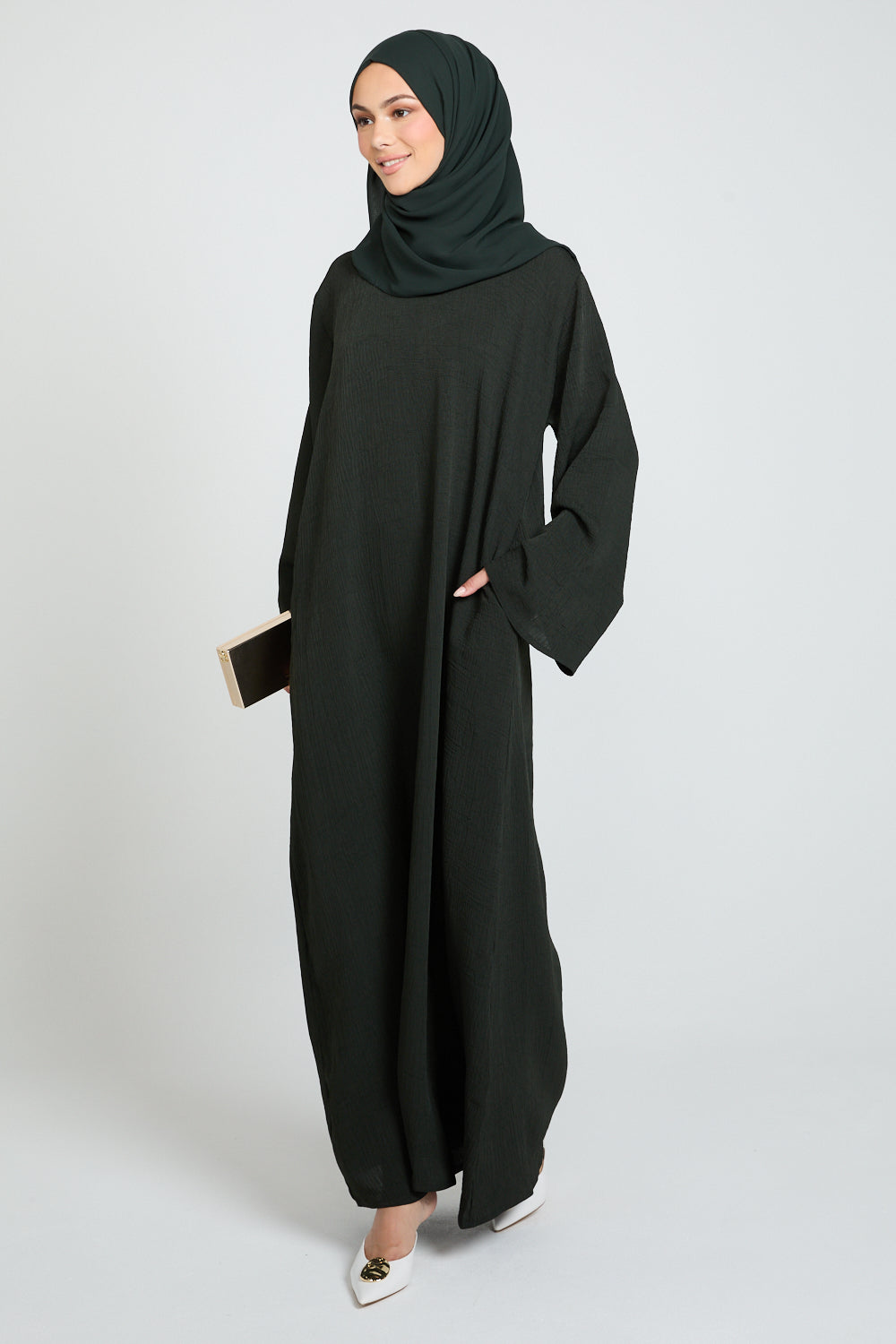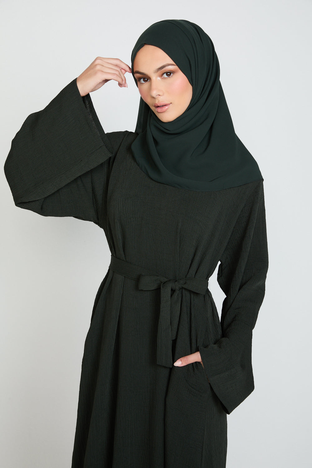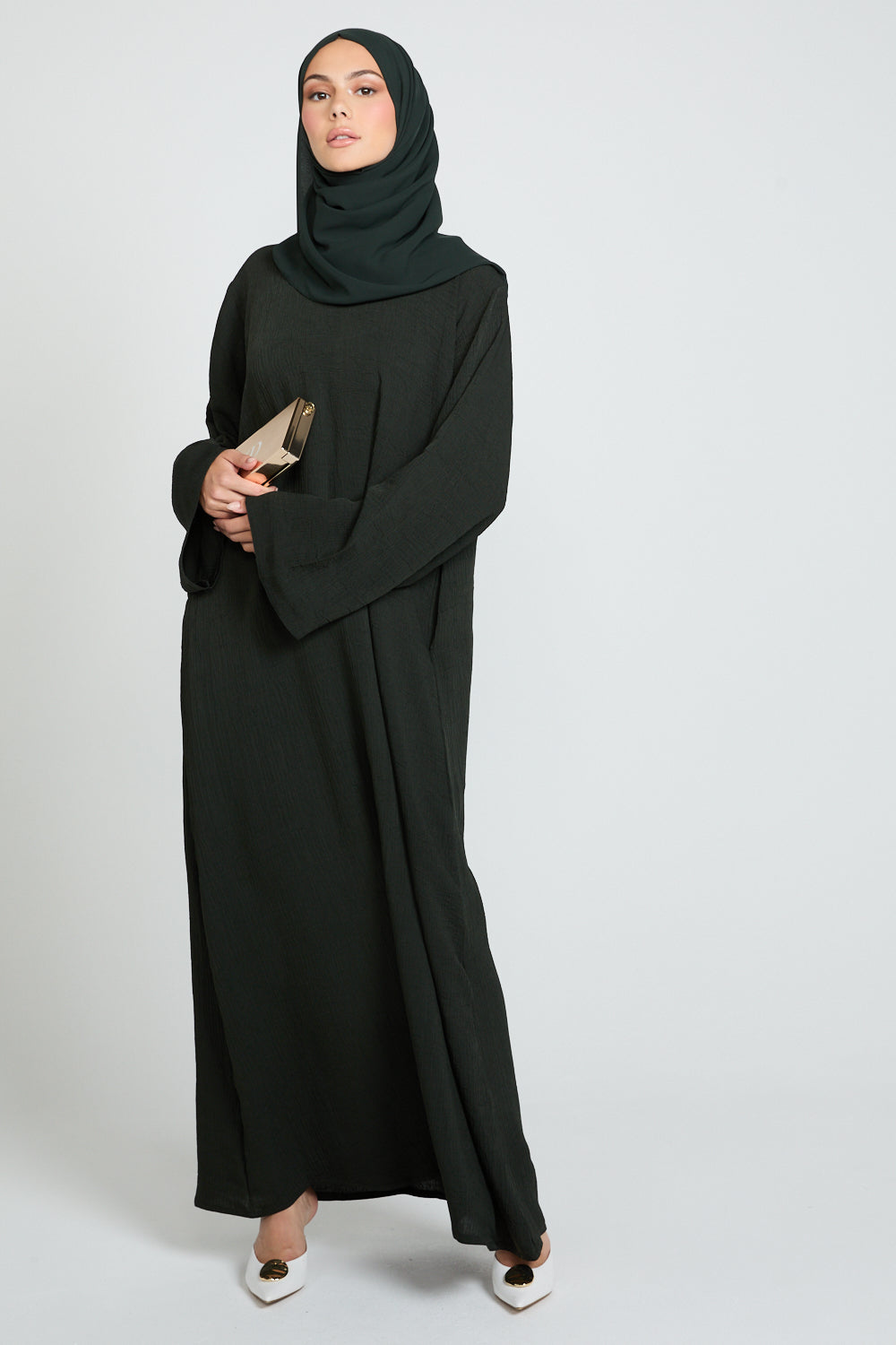 Premium Textured Linen Blend Closed Abaya with Pockets - Deep Forest Green