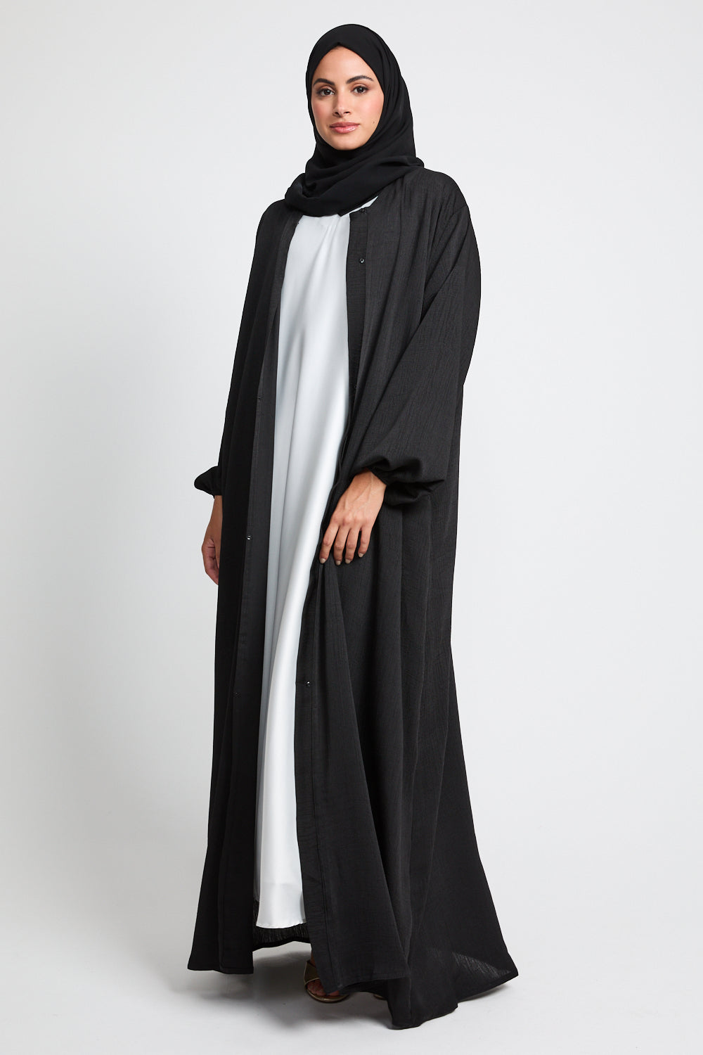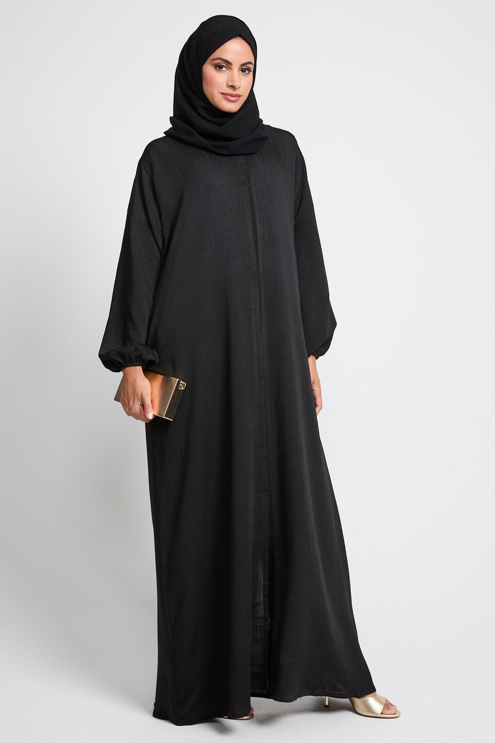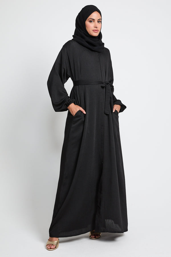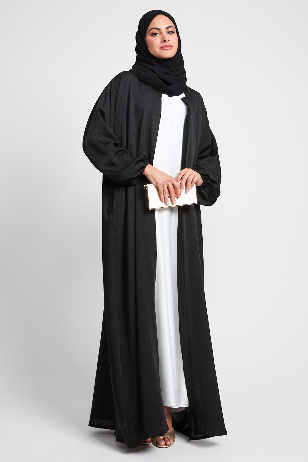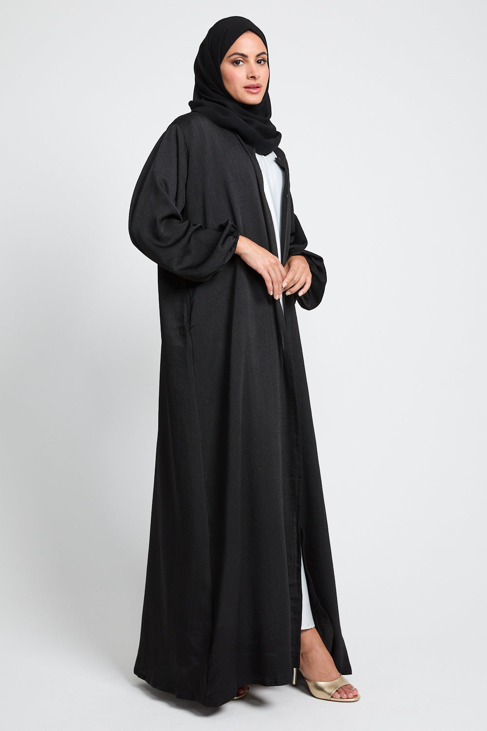 Premium Textured Linen Blend Open Abaya with Pockets - Black