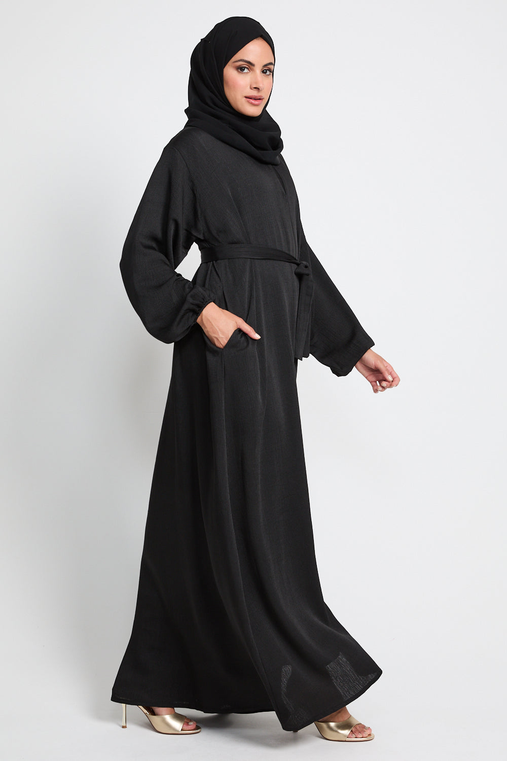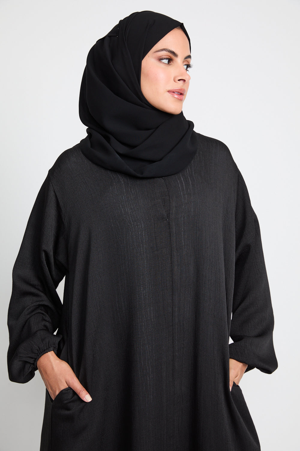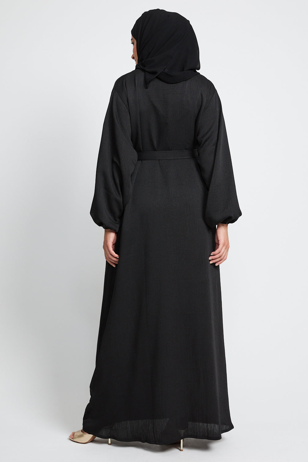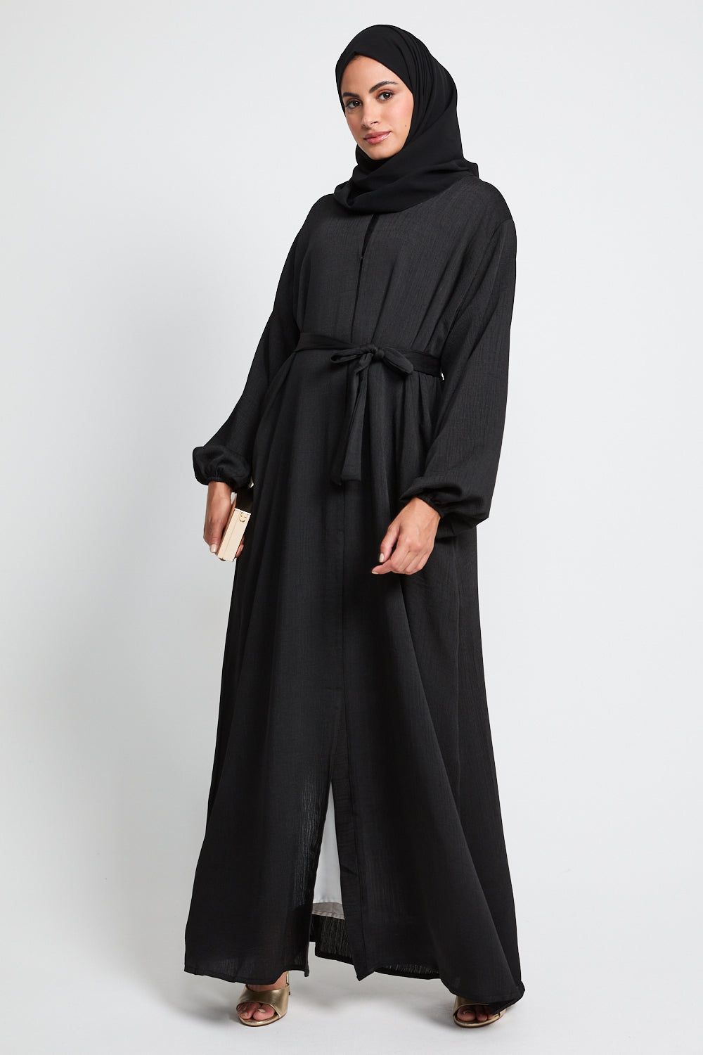 Premium Textured Linen Blend Open Abaya with Pockets - Black