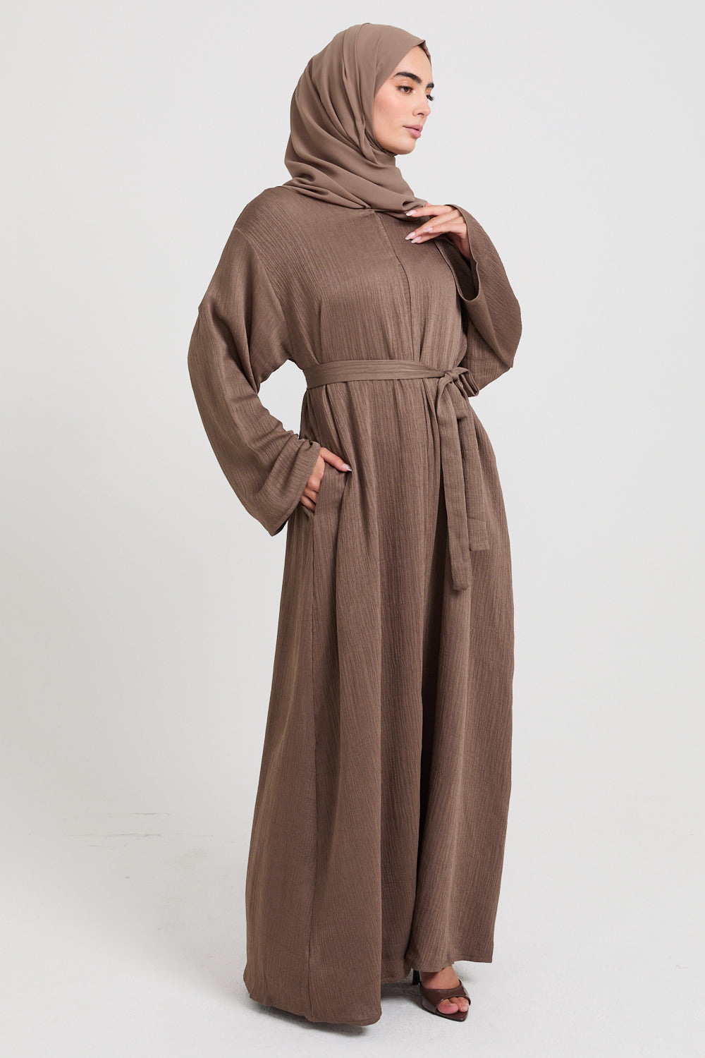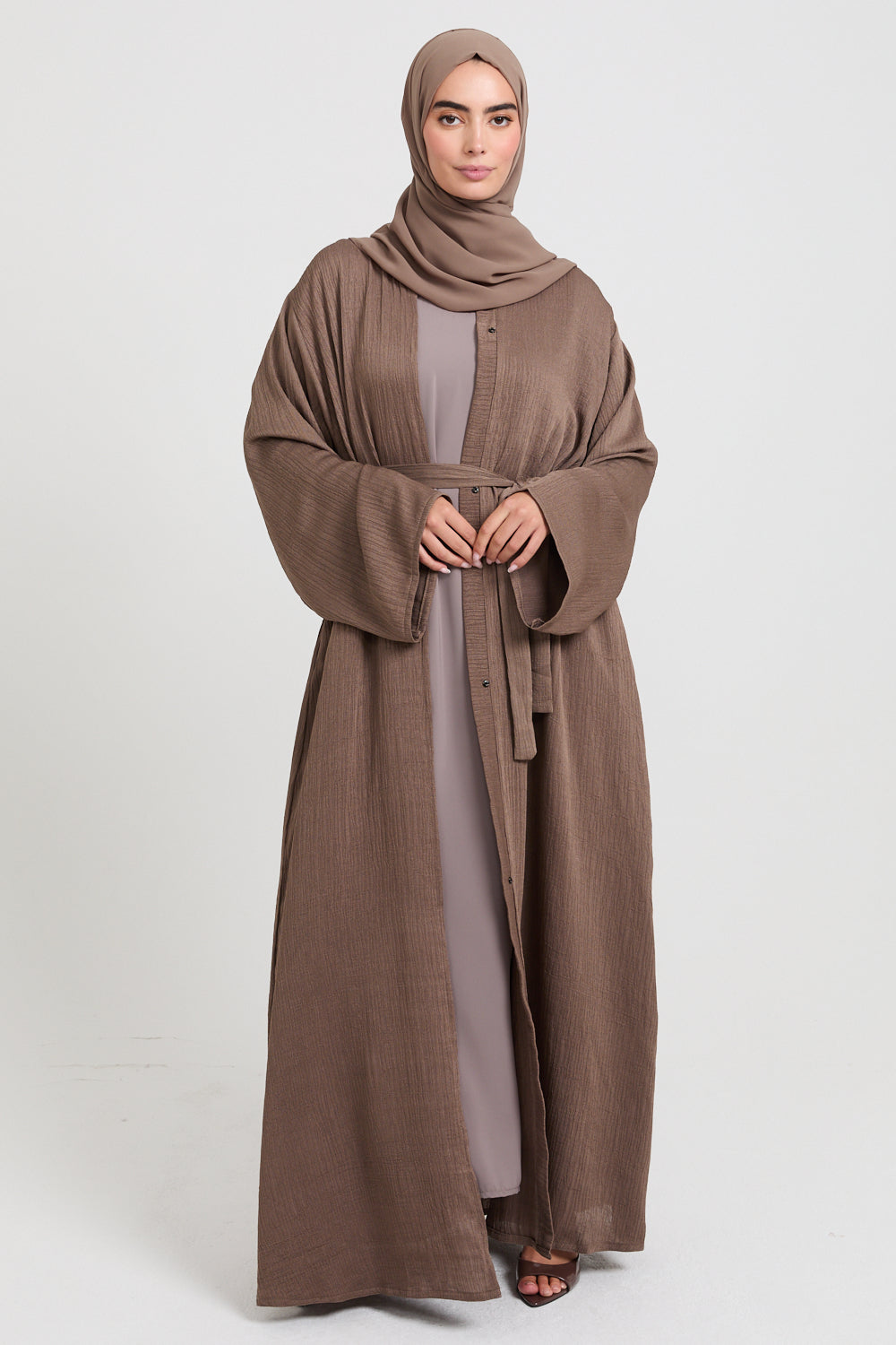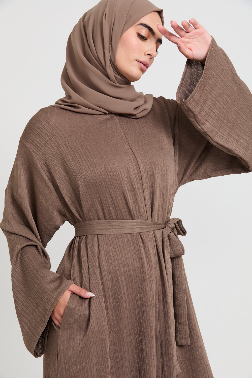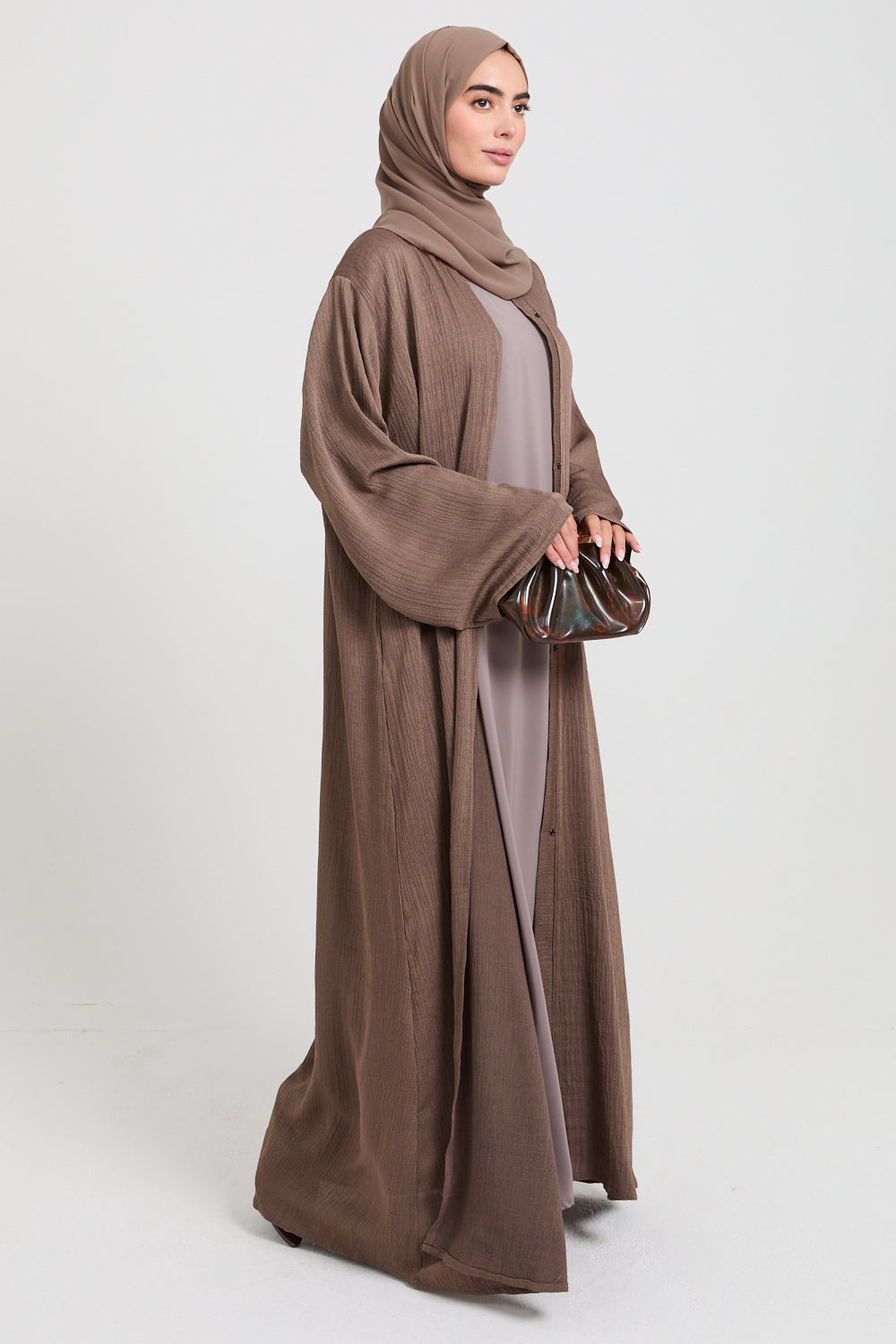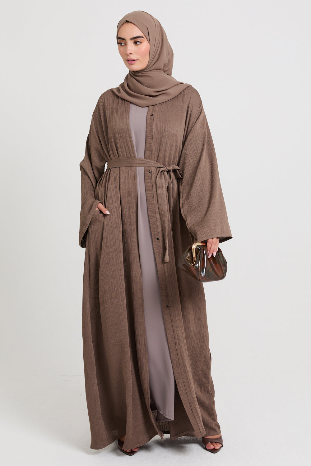 Premium Textured Linen Blend Open Abaya with Pockets - Desert Mocha