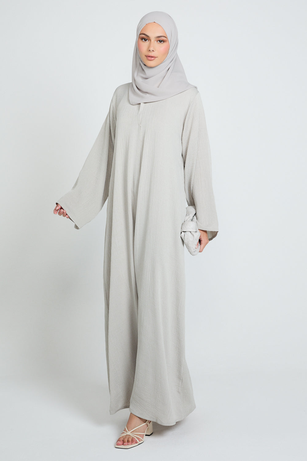 Crafted from a lightweight linen blend with a delicate texture, this abaya adds quiet dimension to your look while offering breathable comfort for warmer days. The gently structured weave enhances the silhouette, allowing it to drape gracefully with every movement.