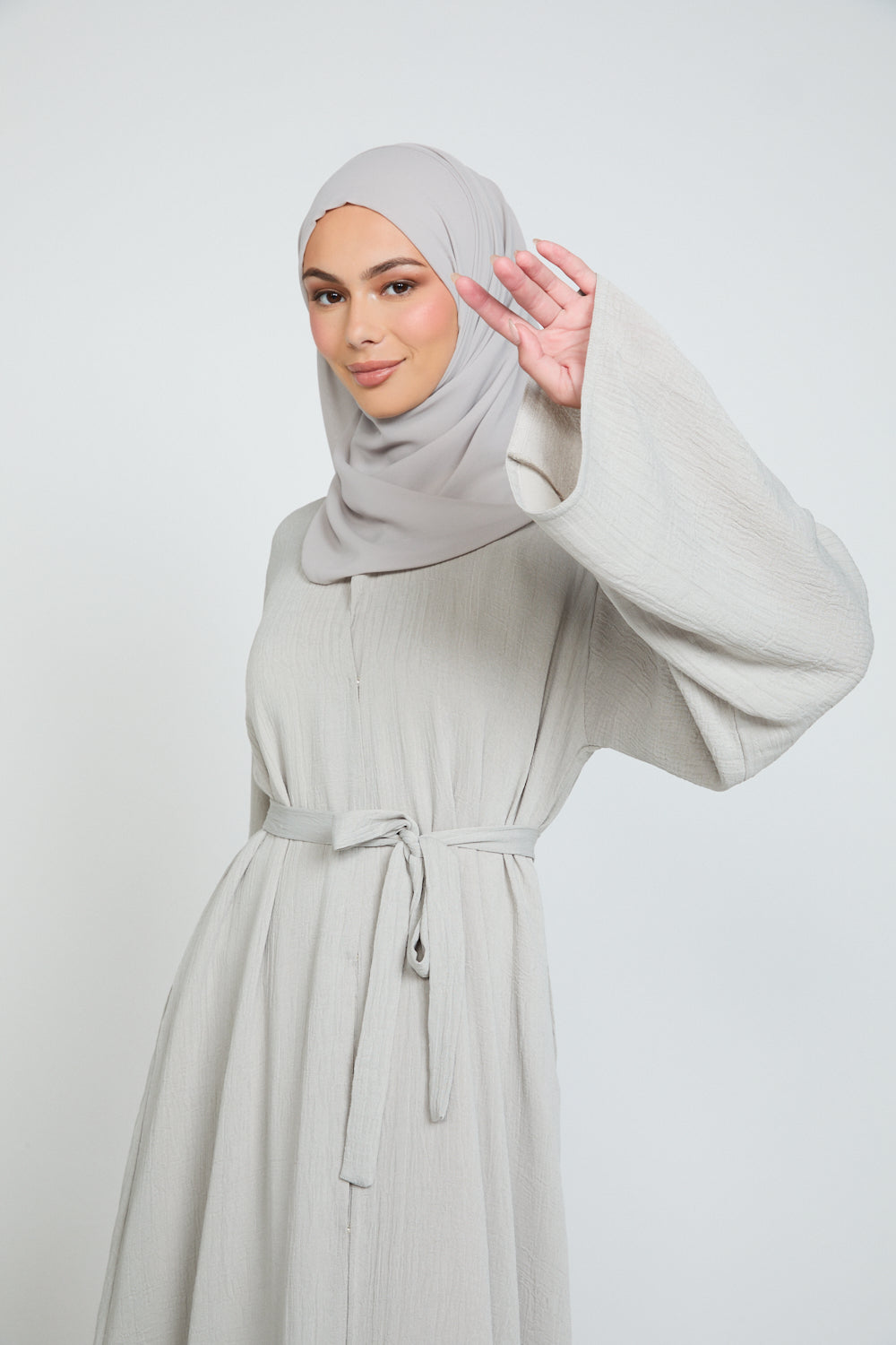 Introducing the Premium Textured Linen Blend Open Abaya in Moonstone Mist – a serene, silken gray with subtle warmth, inspired by soft morning light and timeless minimalism. This neutral hue brings a refined calm to your wardrobe, pairing beautifully with everything from crisp whites to deeper, earthy tones.