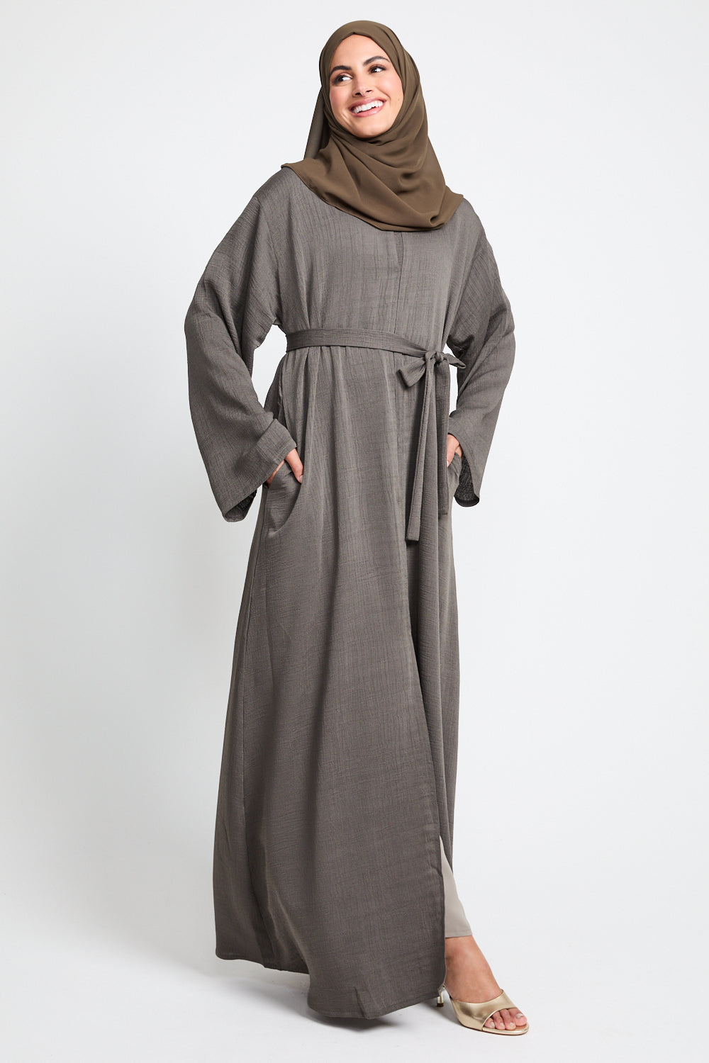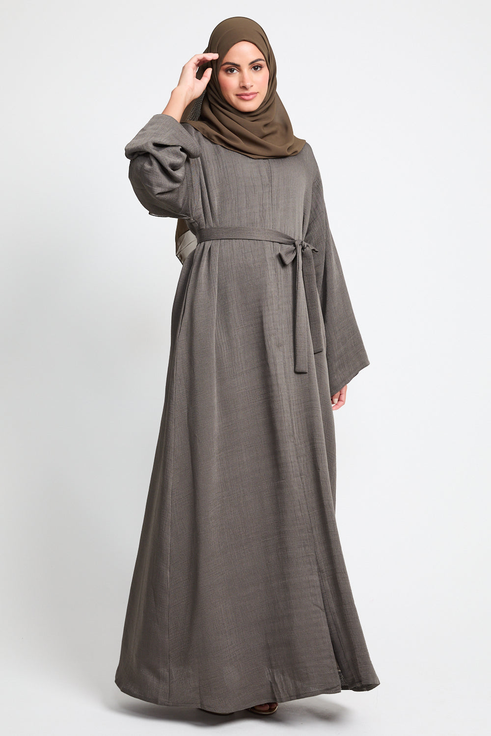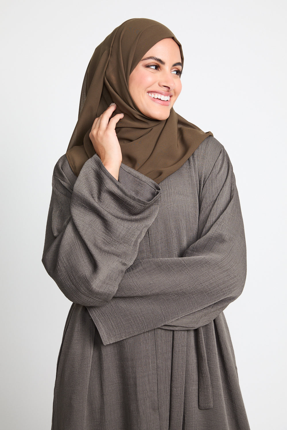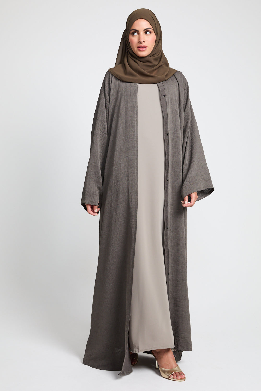 Discover refined ease with the Premium Textured Linen Blend Open Abaya in Olive Brown. A sophisticated neutral inspired by the grounded elegance of nature.