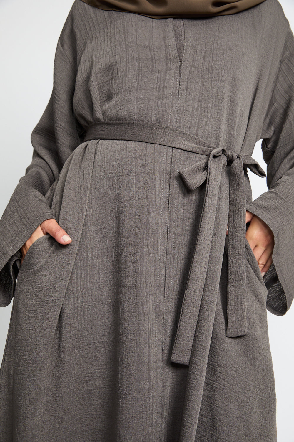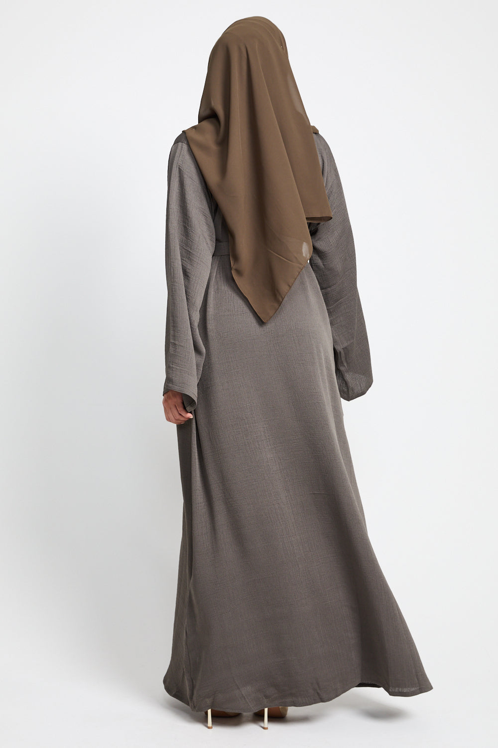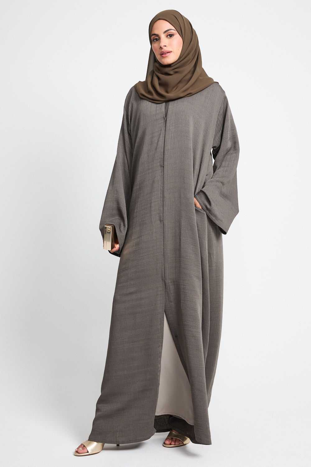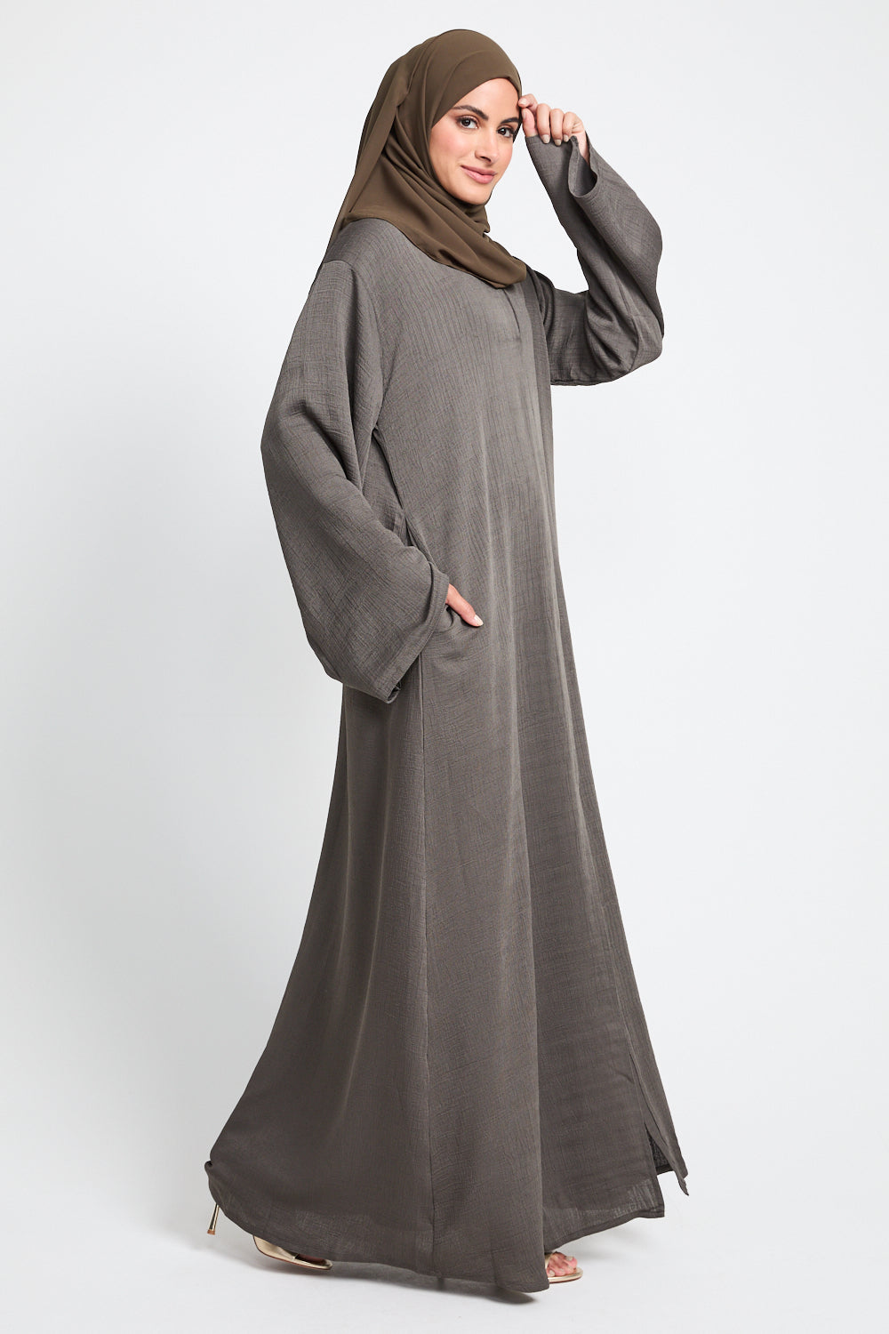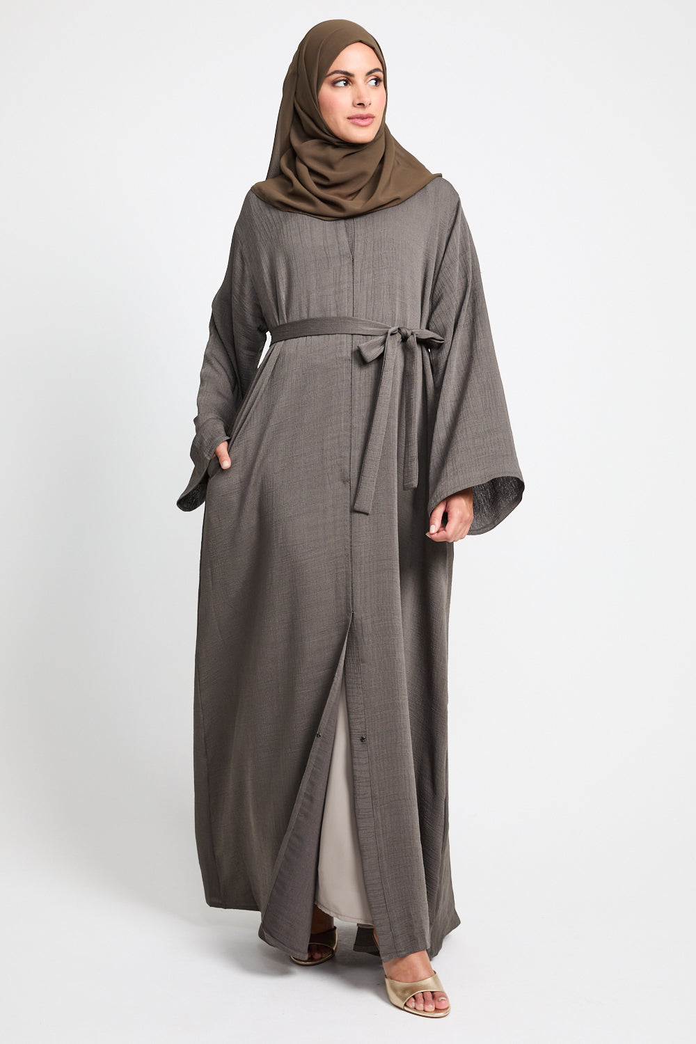 Discover refined ease with the Premium Textured Linen Blend Open Abaya in Olive Brown. A sophisticated neutral inspired by the grounded elegance of nature.